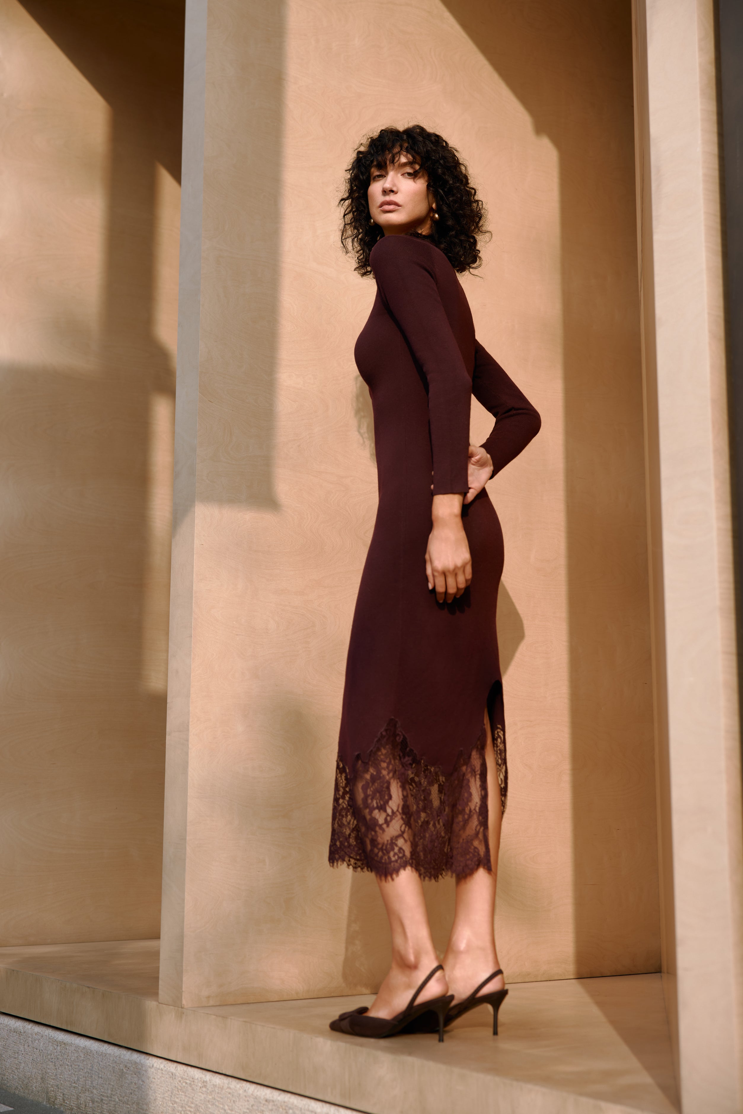 Where comfort meets refined style. Draped in a soft wool knit with a flattering V-neck and long sleeves, this midi-length dress is finished with an elegant lace hem. Wear it from brunch to an evening event for a look that’s as versatile as it is charming.