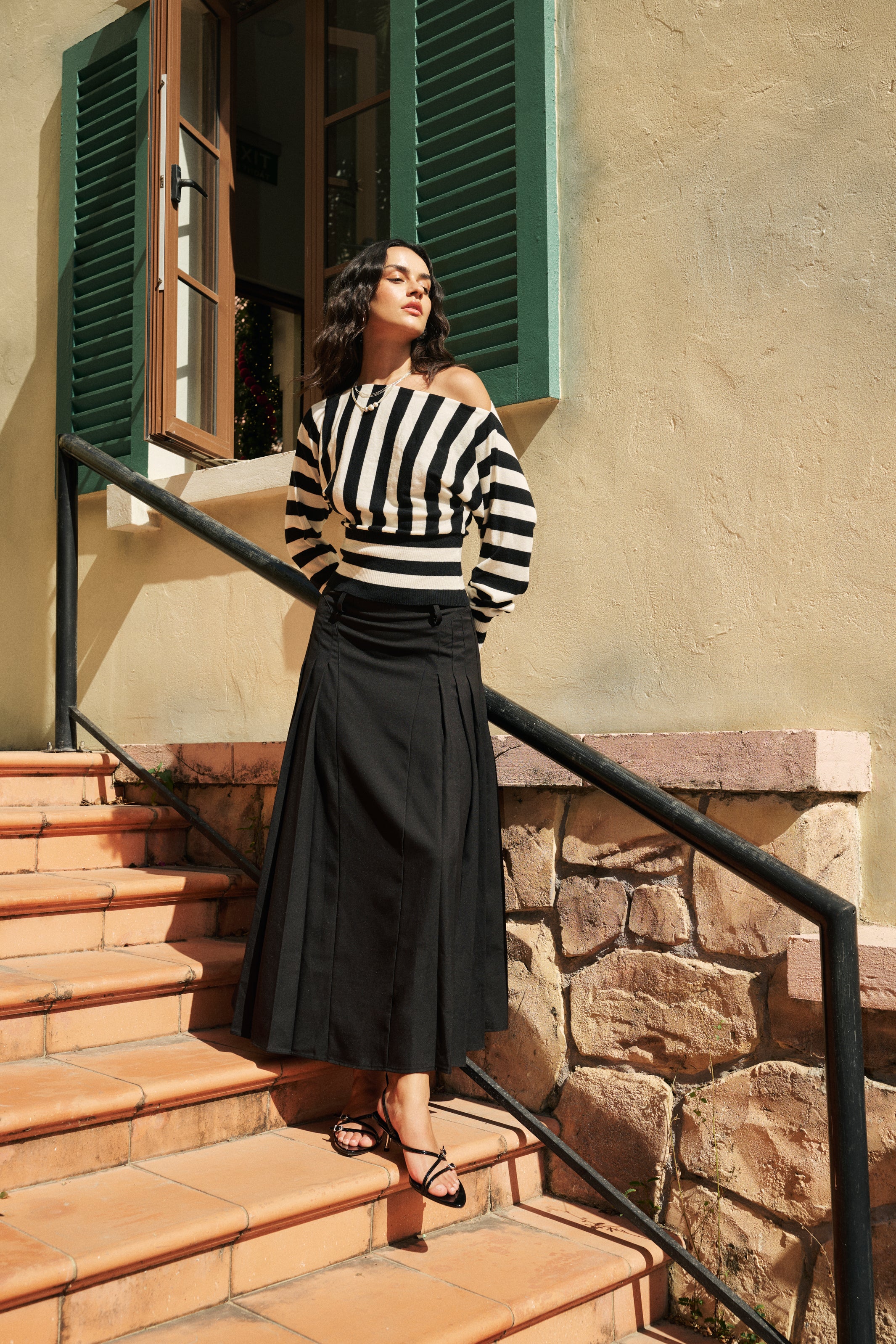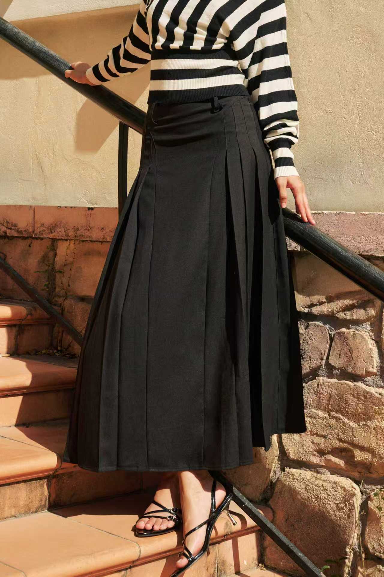 With its minimalist A-line silhouette and architectural pleat detailing, this piece is a versatile staple. It pairs effortlessly with cropped knits or sleek blouses for instant sophistication.