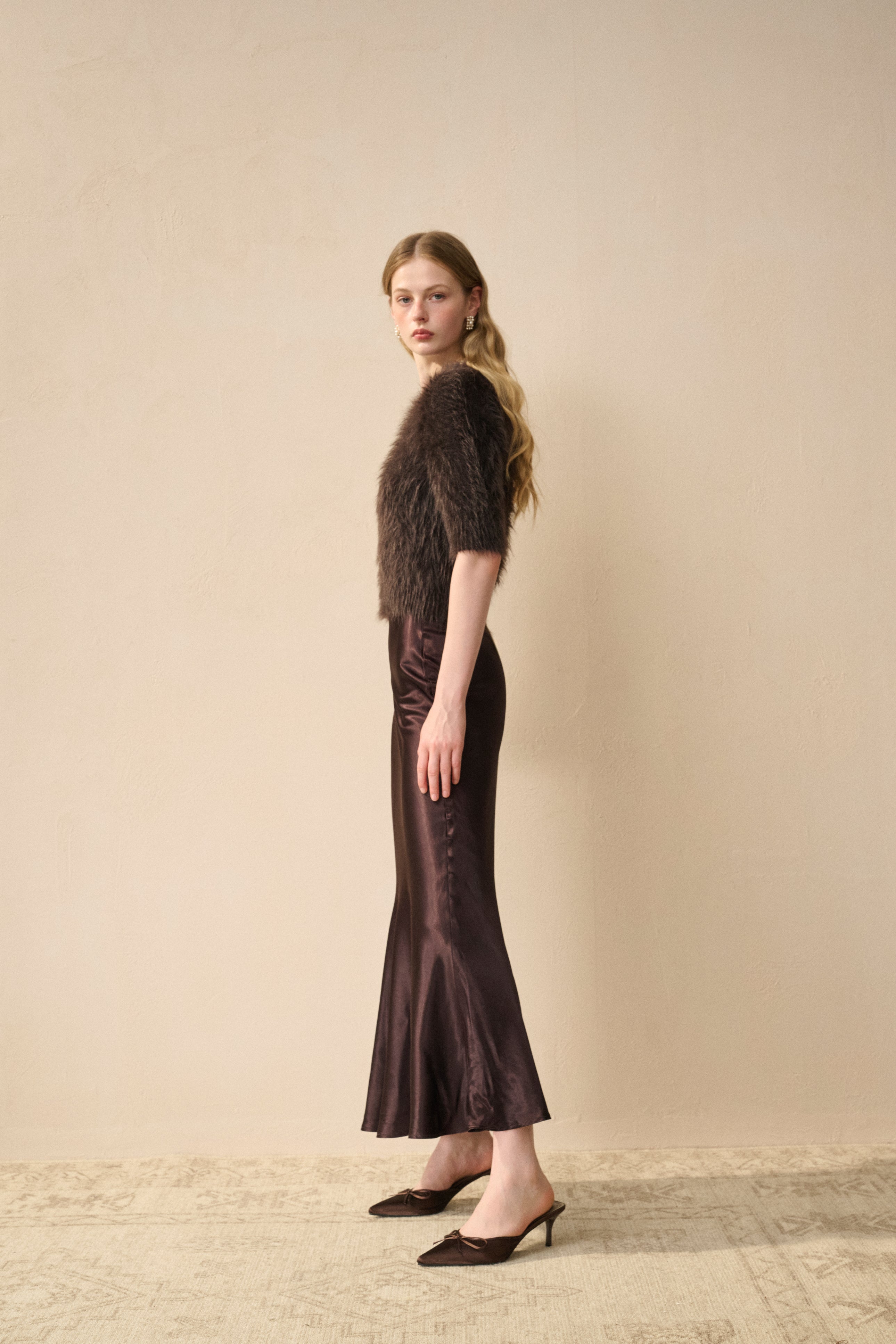 Let the liquid drape of our satin skirt create a cascade of elegance. This maxi skirt is designed for movement, with a soft, non-restrictive cut that flows into a beautifully draped mermaid-inspired hem.