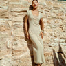This dress embodies a minimalist aesthetic with its clean lines and timeless, plunging V-neck silhouette. Delicate pearl accents provide the only necessary adornment, offering a whisper of refinement.