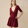 Dressed in a vibrant red, this wool mini dress combines a flattering V-neck and slim fit with striking details—a metallic waist chain and a detachable floral brooch. Perfect for celebrating in style.