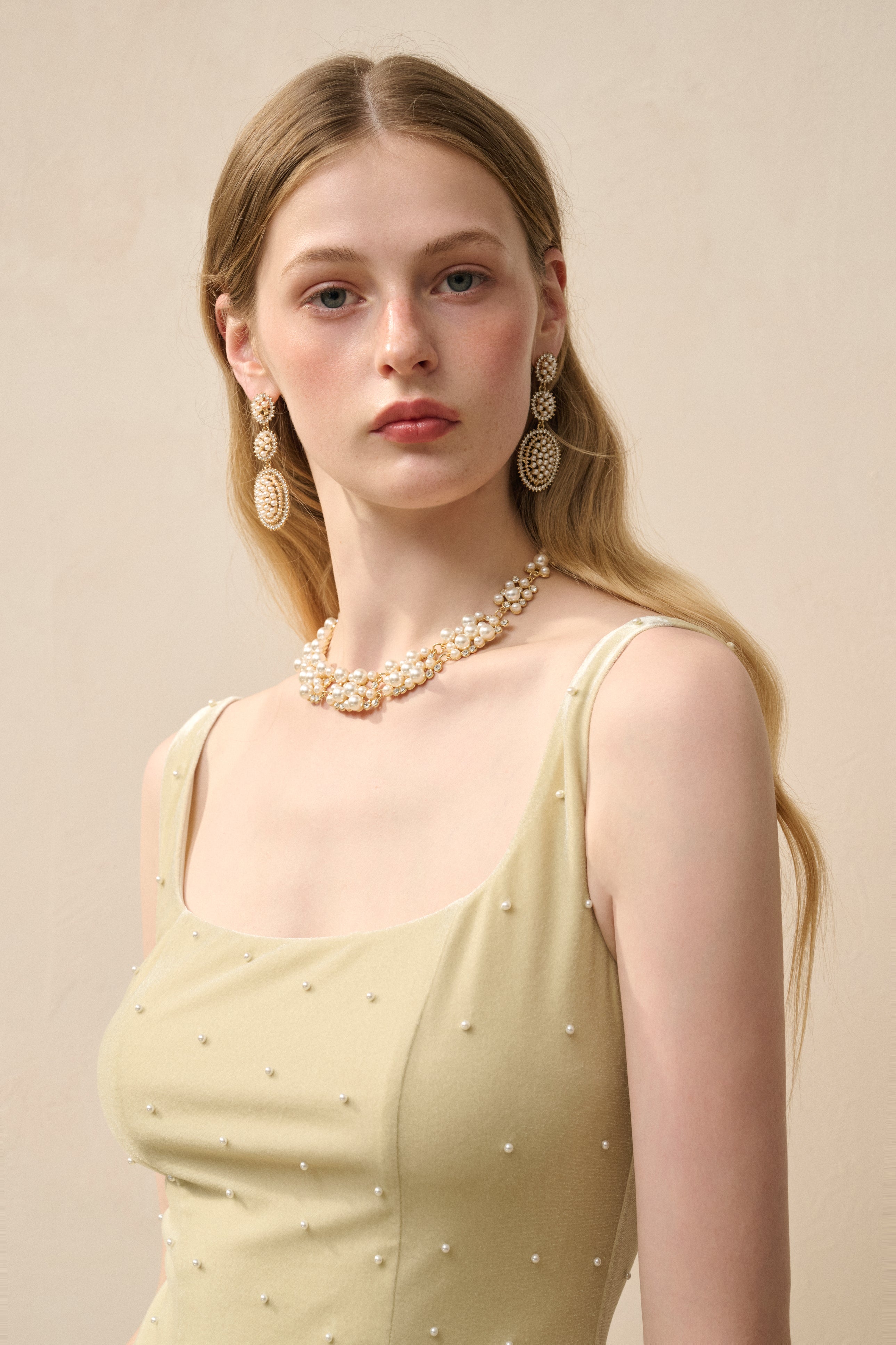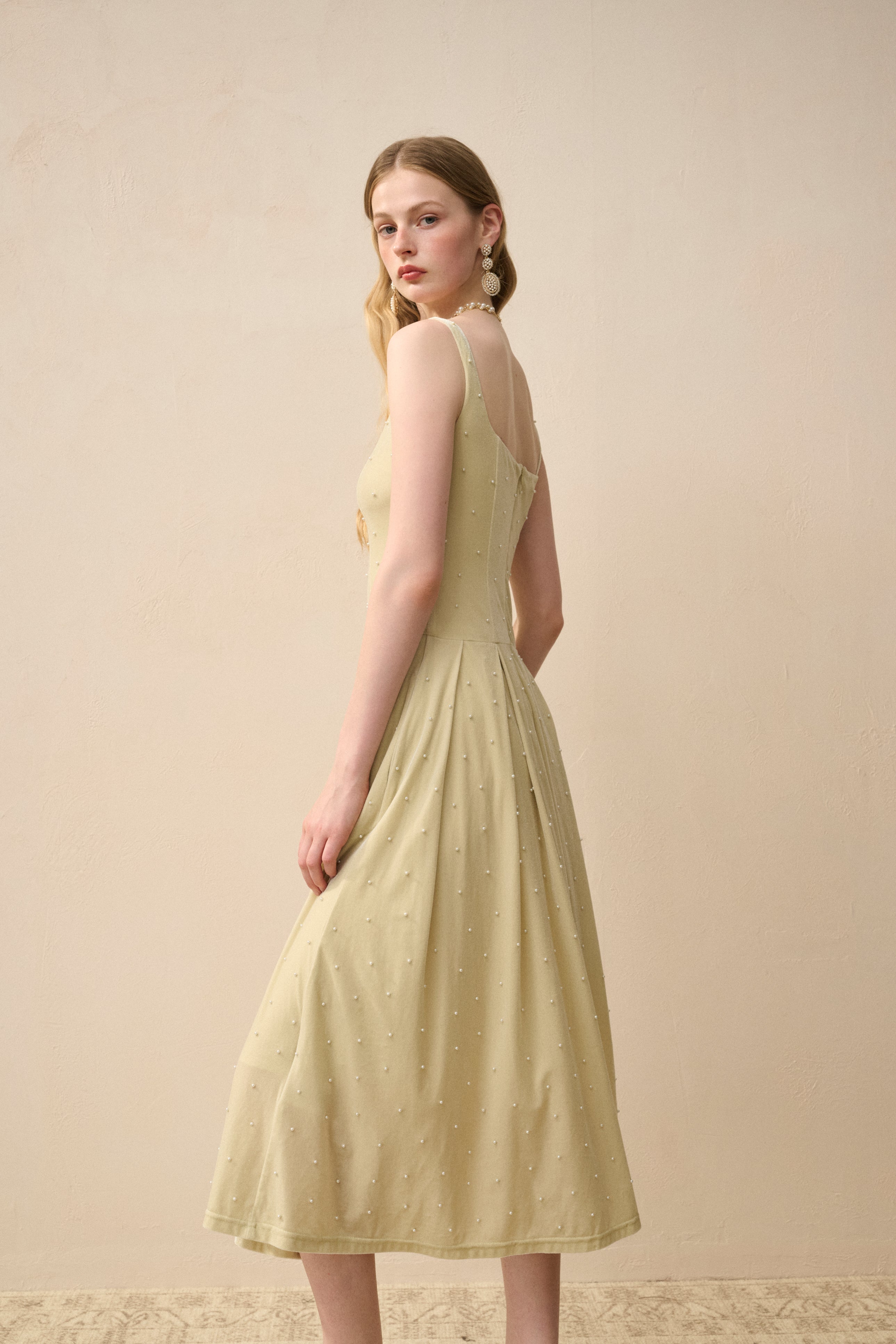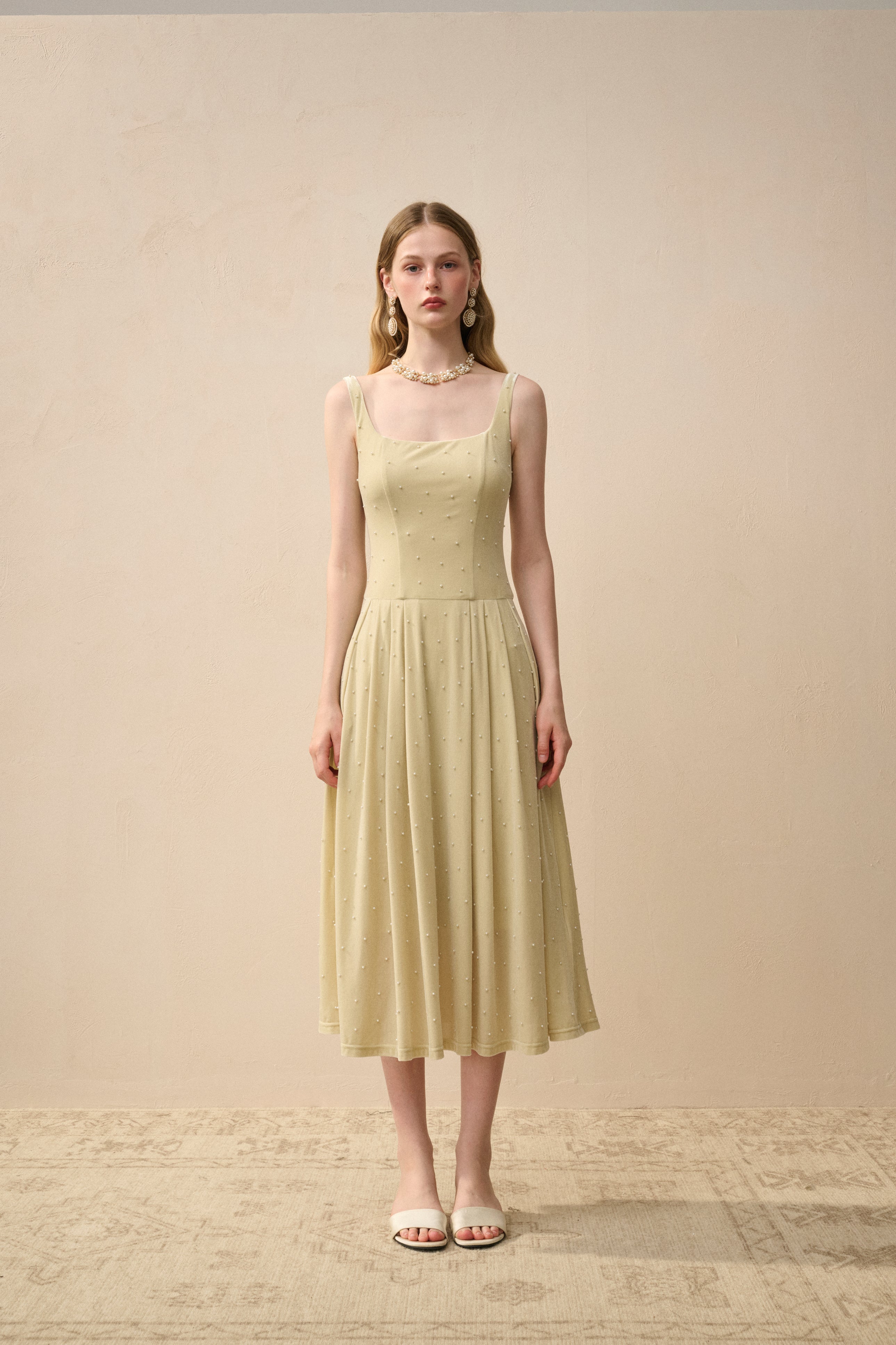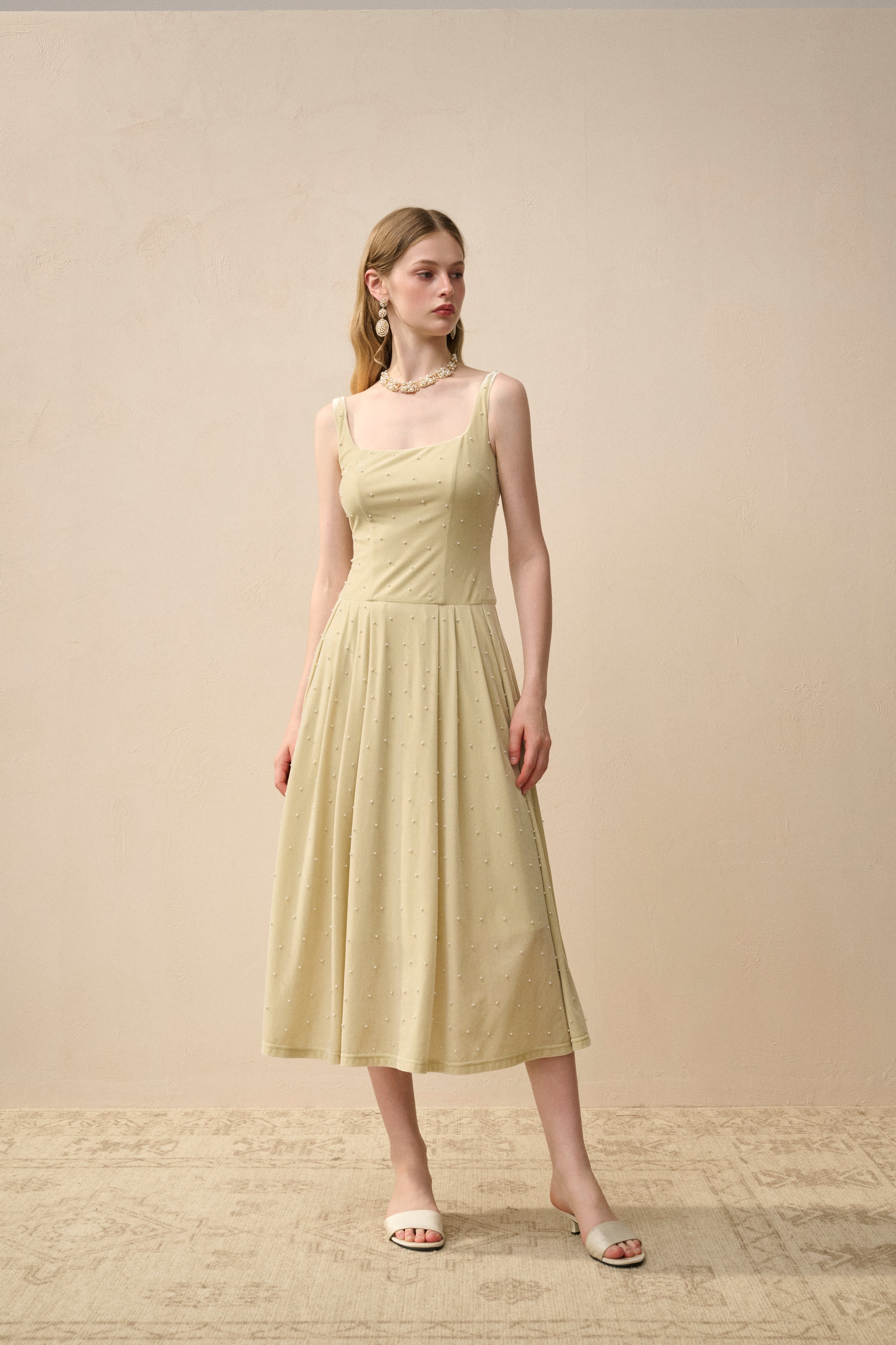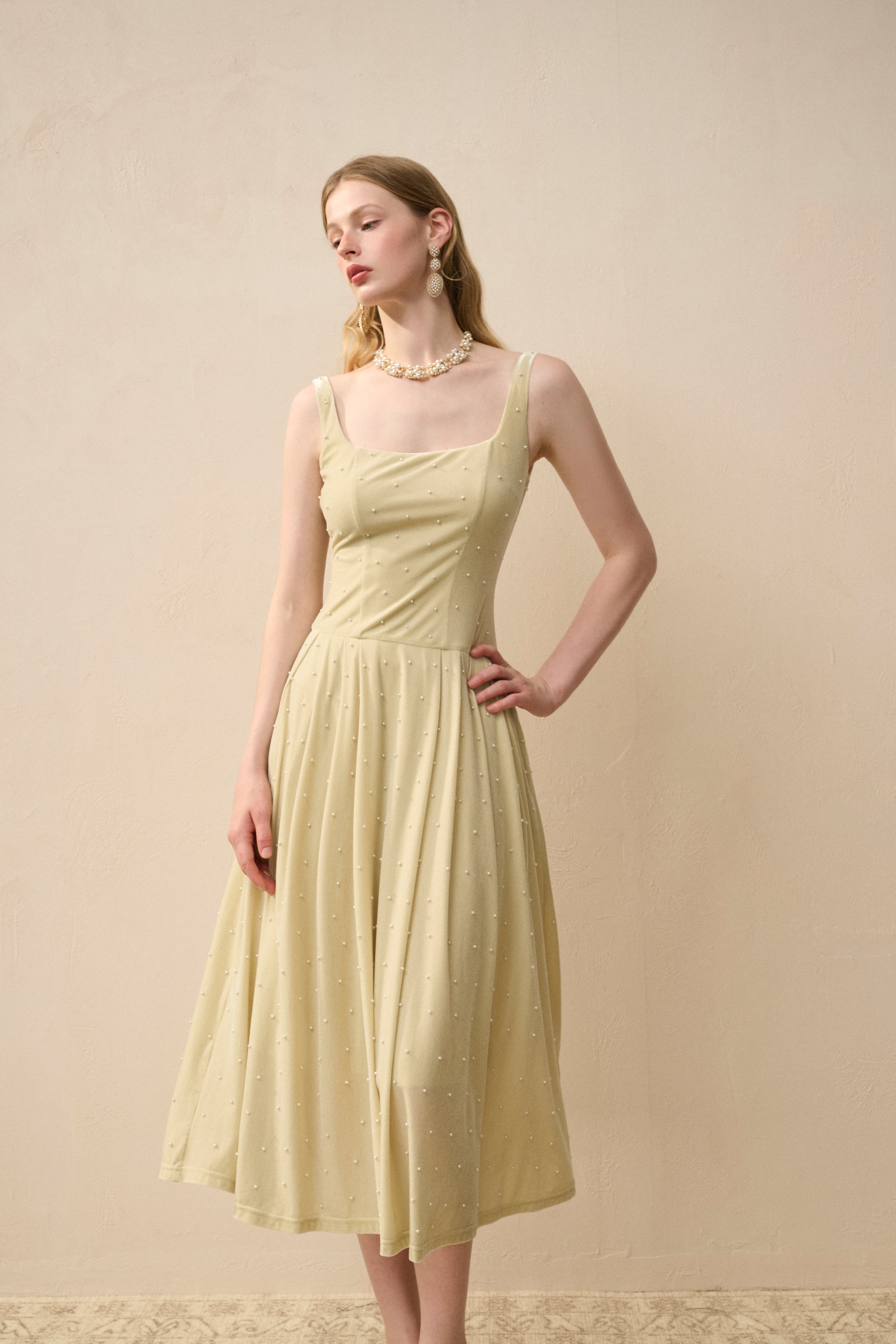 Made for the spotlight—this square-neck midi dress in lightweight stretch velvet is intricately adorned with pearls from top to bottom. The fit-and-flare silhouette cinches at the waist, then floats effortlessly with every step.