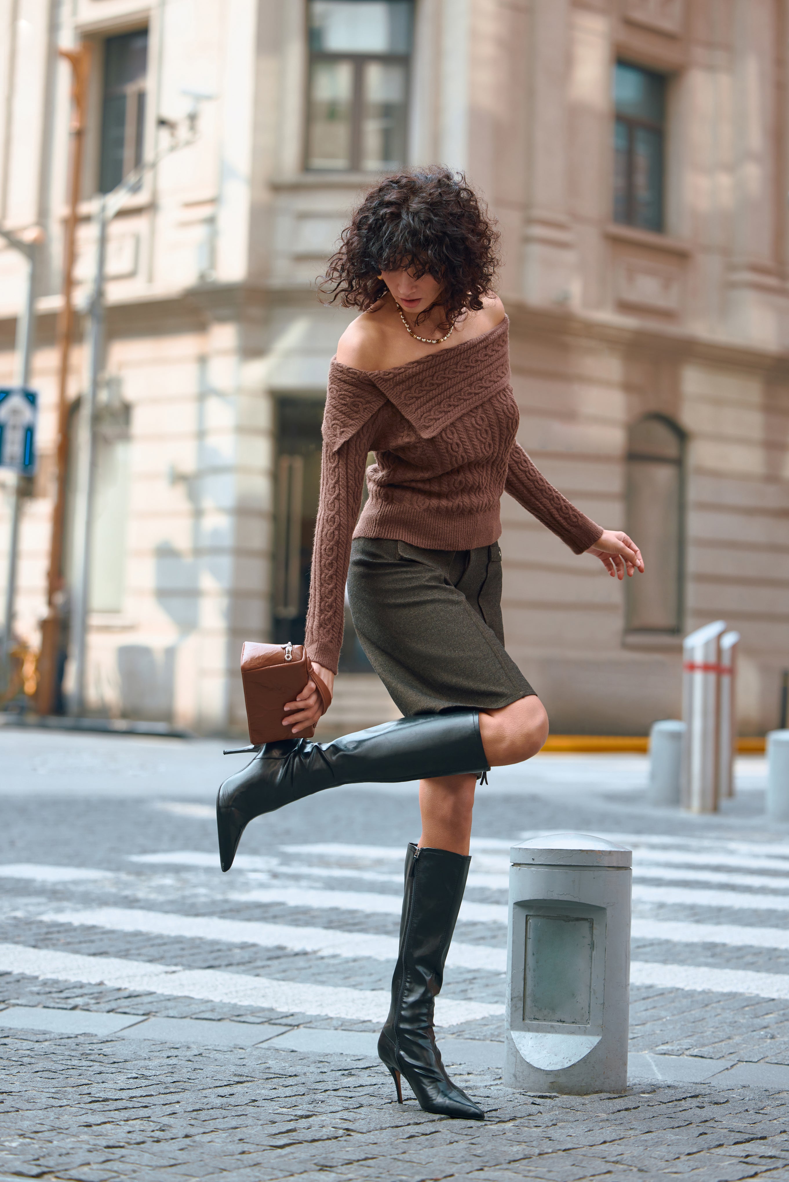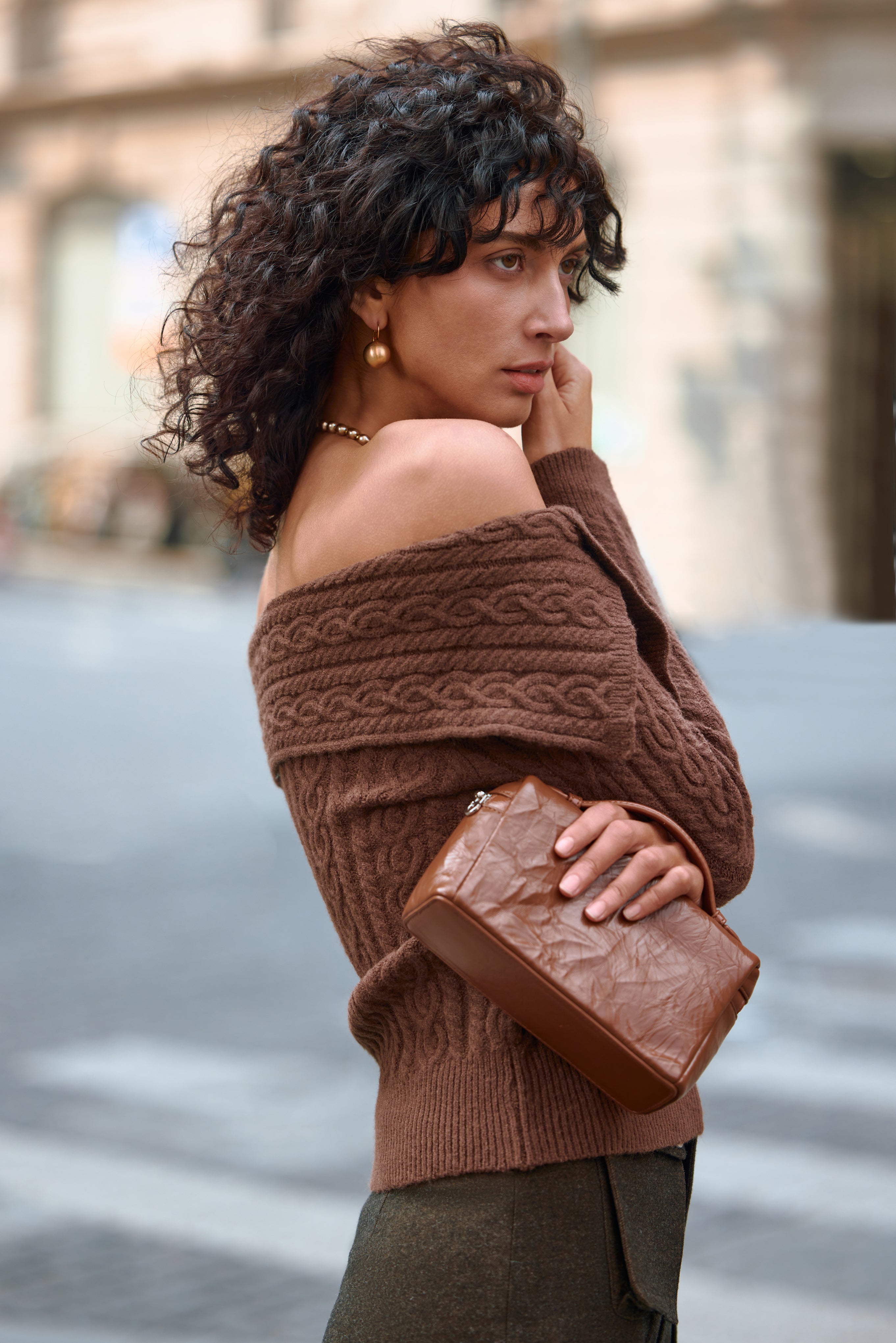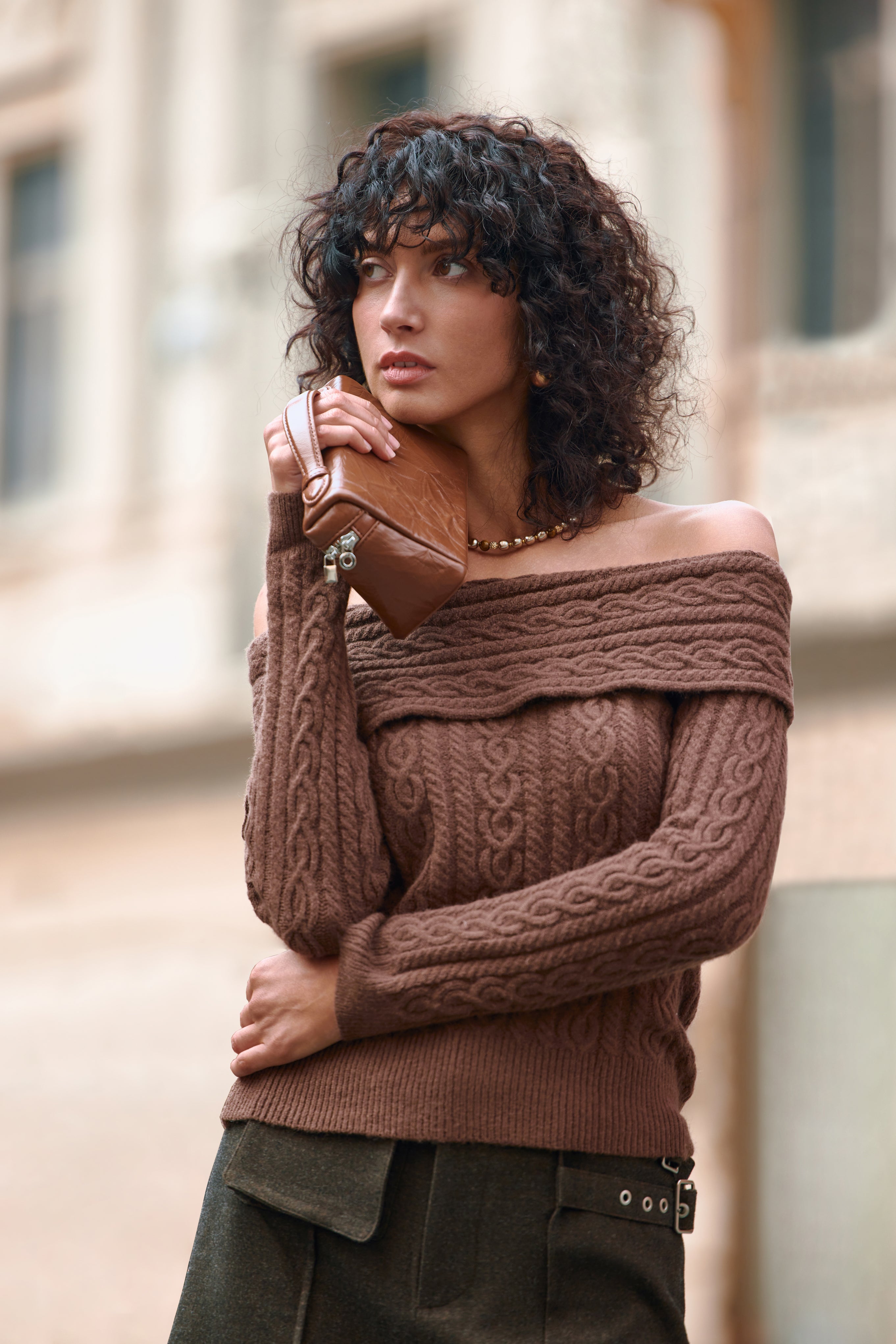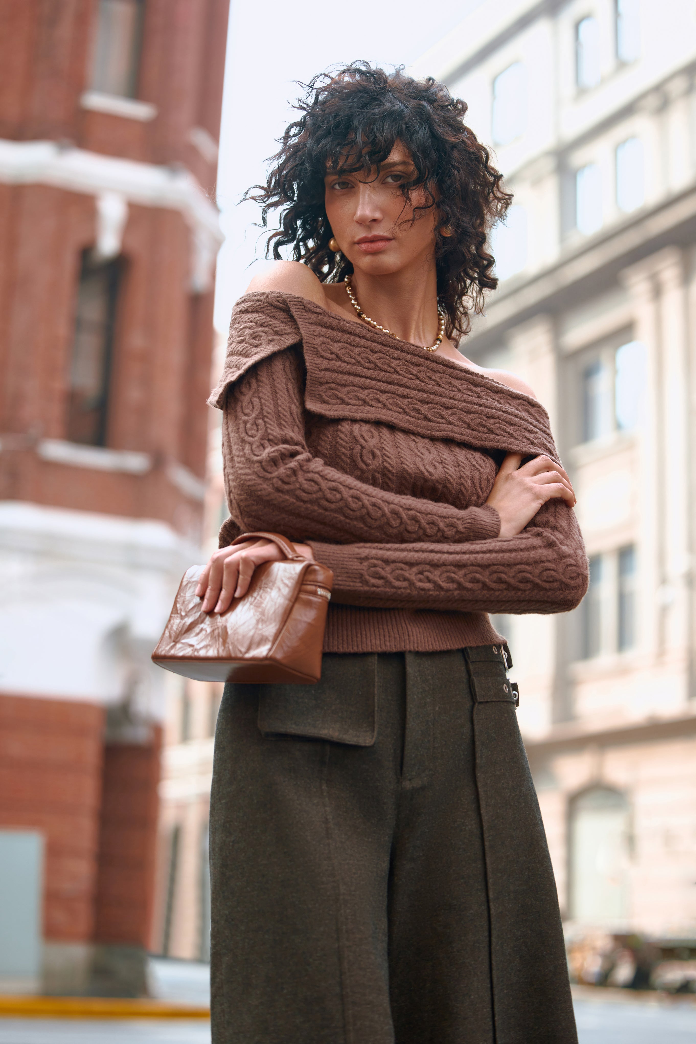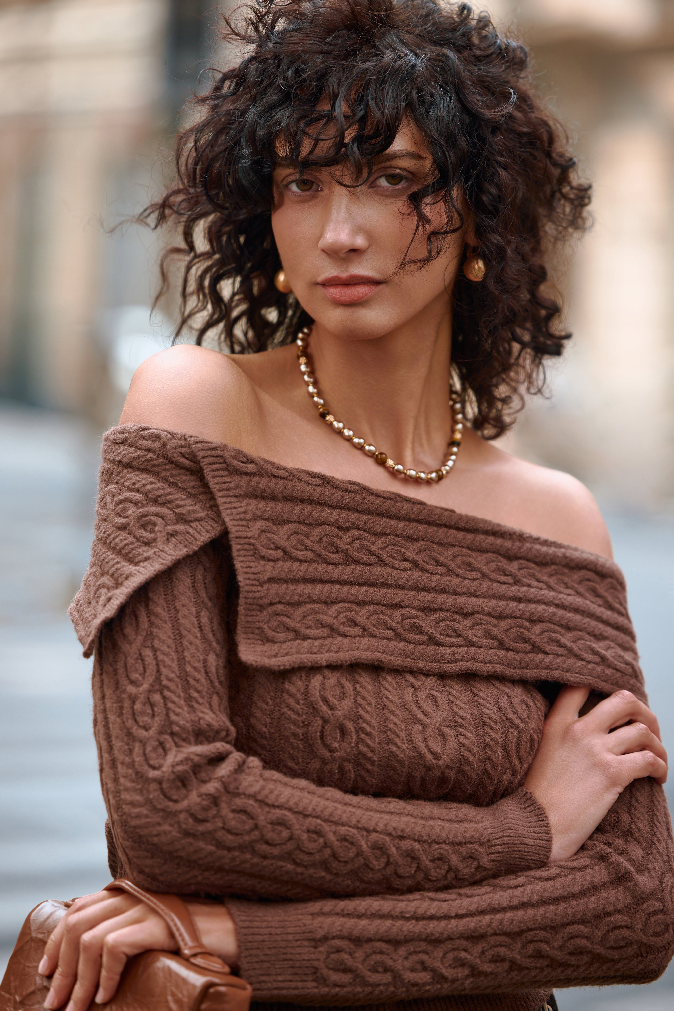 Featuring rich cable knitting in a mid-weight stretch fabric, this slim-fit sweater is updated with a distinctive fold-down collar that effortlessly creates an off-the-shoulder silhouette—perfect for adding an intentional touch to any outfit.
