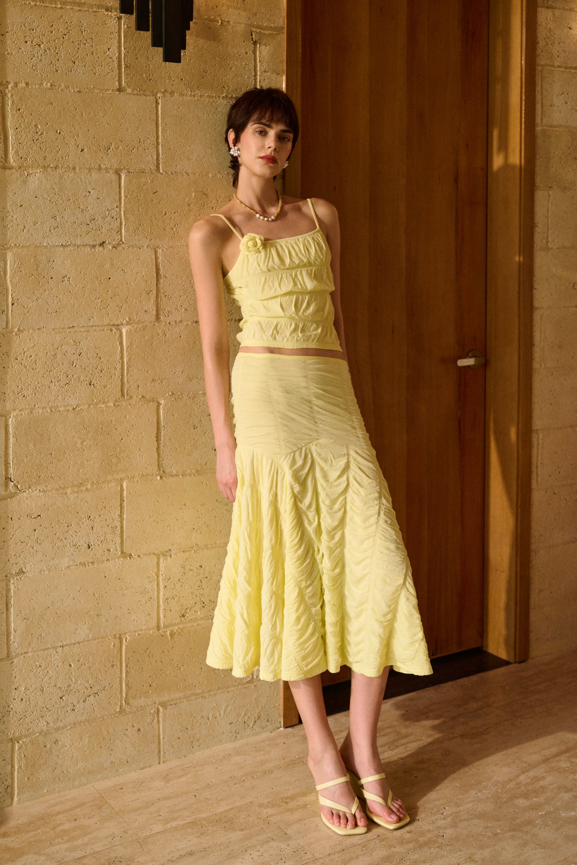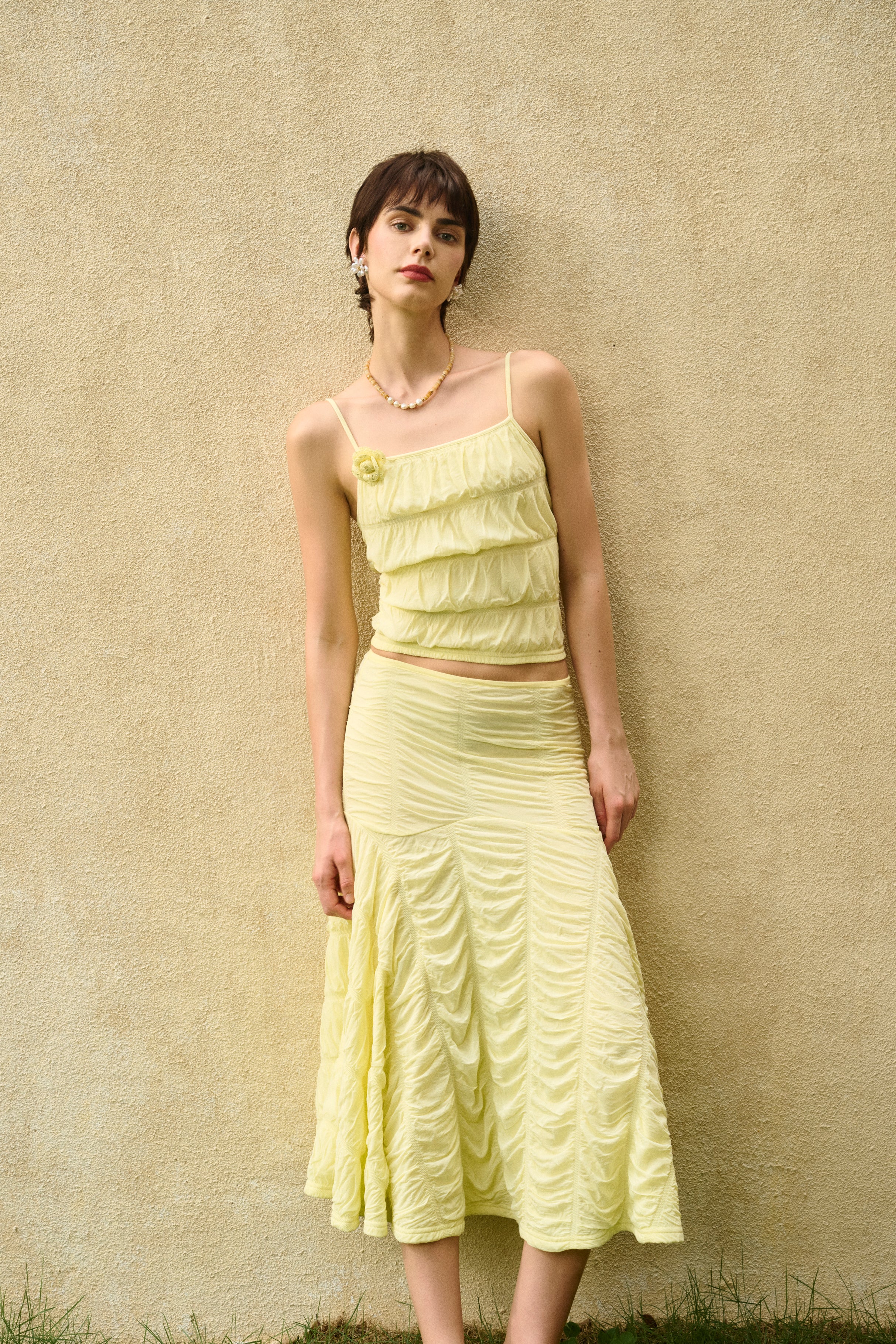 This two-piece set exudes effortless, sunlit romance. The tiered cami top with delicate flower detail pairs beautifully with the matching ruched midi skirt. It’s a dreamy, coordinated look perfect for warm-weather outings and casual elegance.
