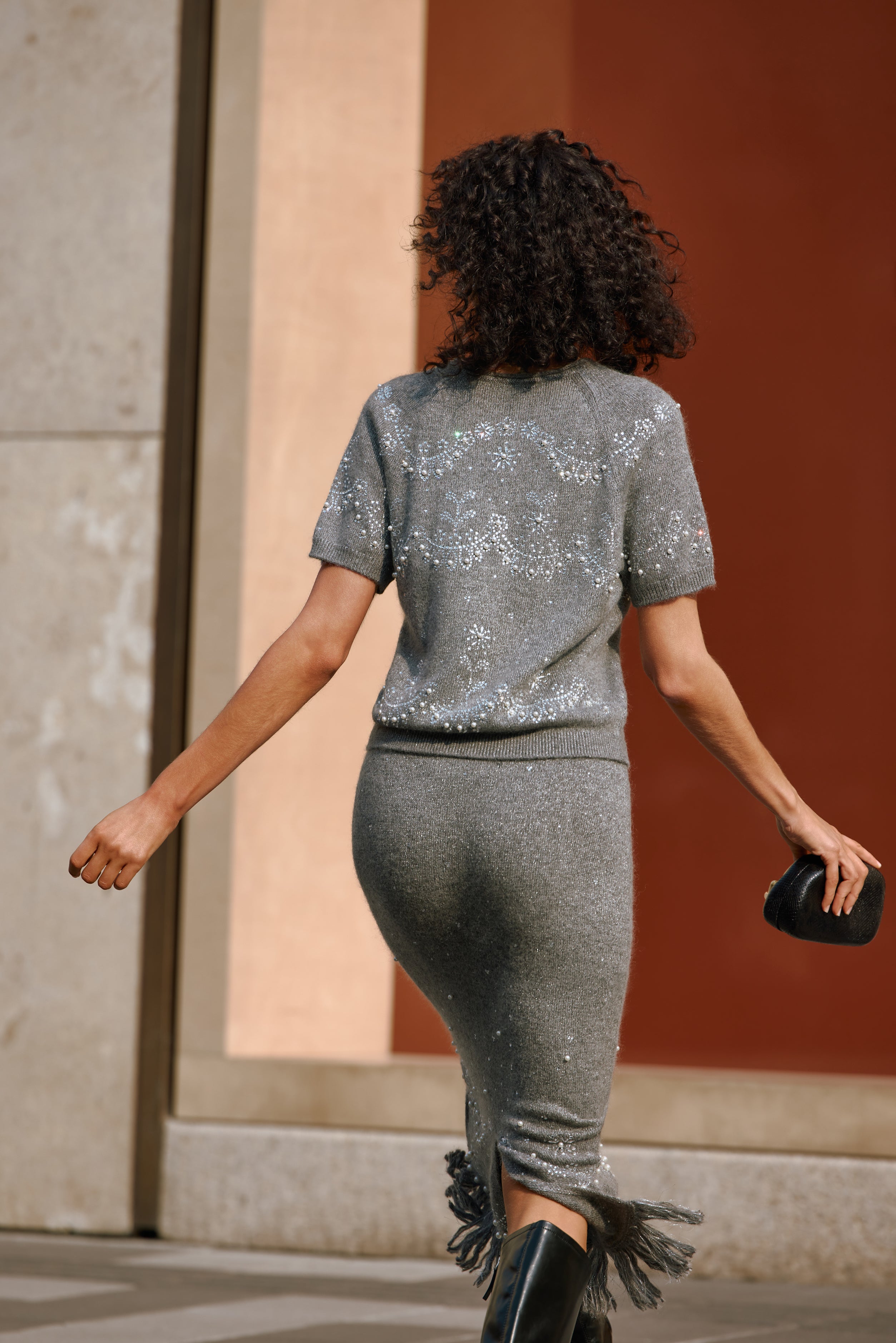 Every step creates magic. This skirt pairs a playful fringed hem with an intricate frosted snowflake design in beads and rhinestones. For a truly enchanting winter look, style it with our matching frosted pearls wool sweater.