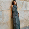 Defined by sophisticated grey and a striking geometric pattern, this wool set offers versatile elegance. The halterneck top lends a sculpted feel, while the maxi skirt moves with you—its front slit ensures ease, and the fringed hem sways with every step, creating a captivating rhythm.