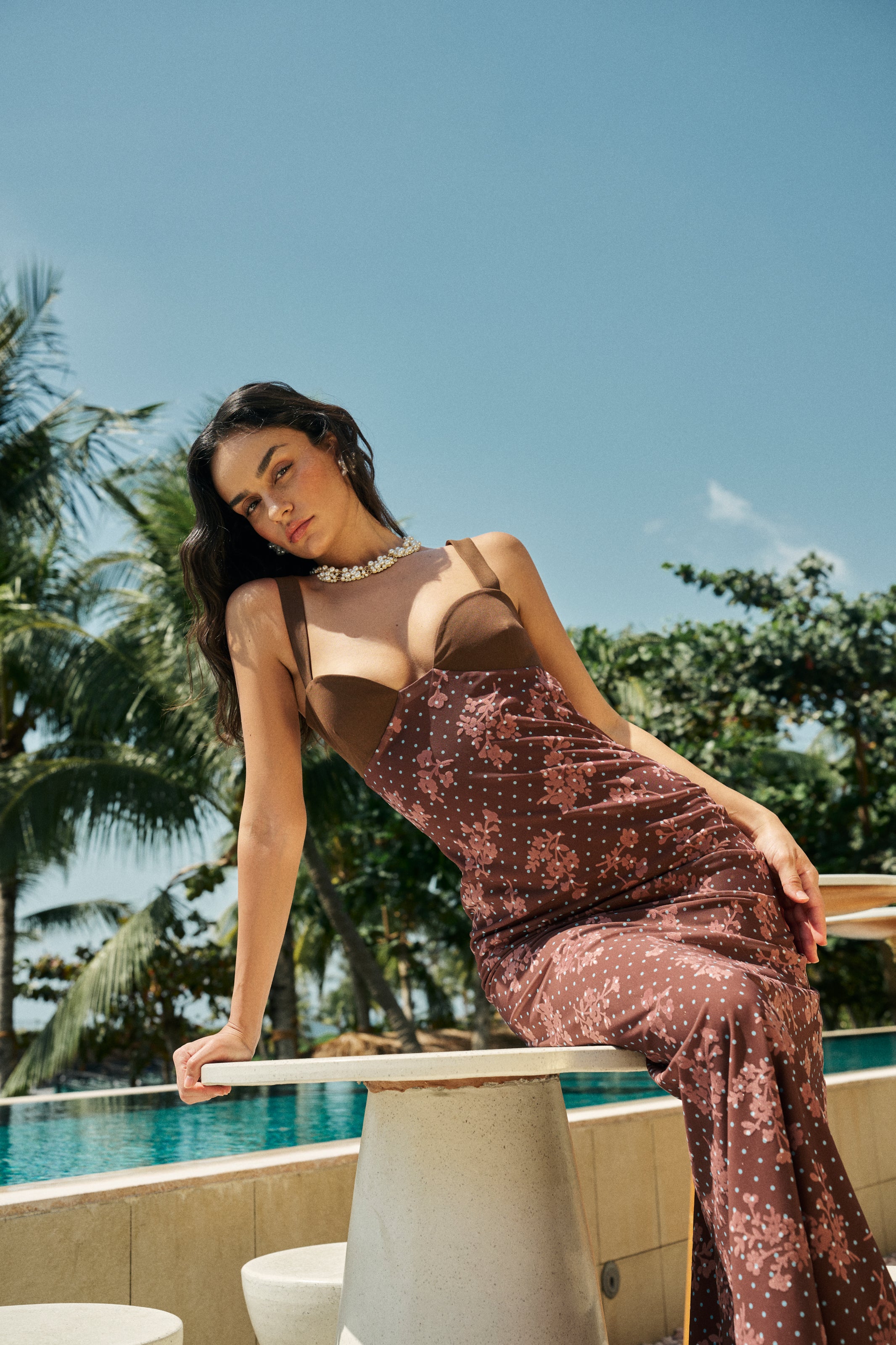 Designed for resort dressing, this backless maxi dress features a playful polka dot floral print and sweetheart bustier bodice. The backless design flows into a maxi skirt with a subtle back slit—an effortlessly romantic piece for sun‑drenched getaways.