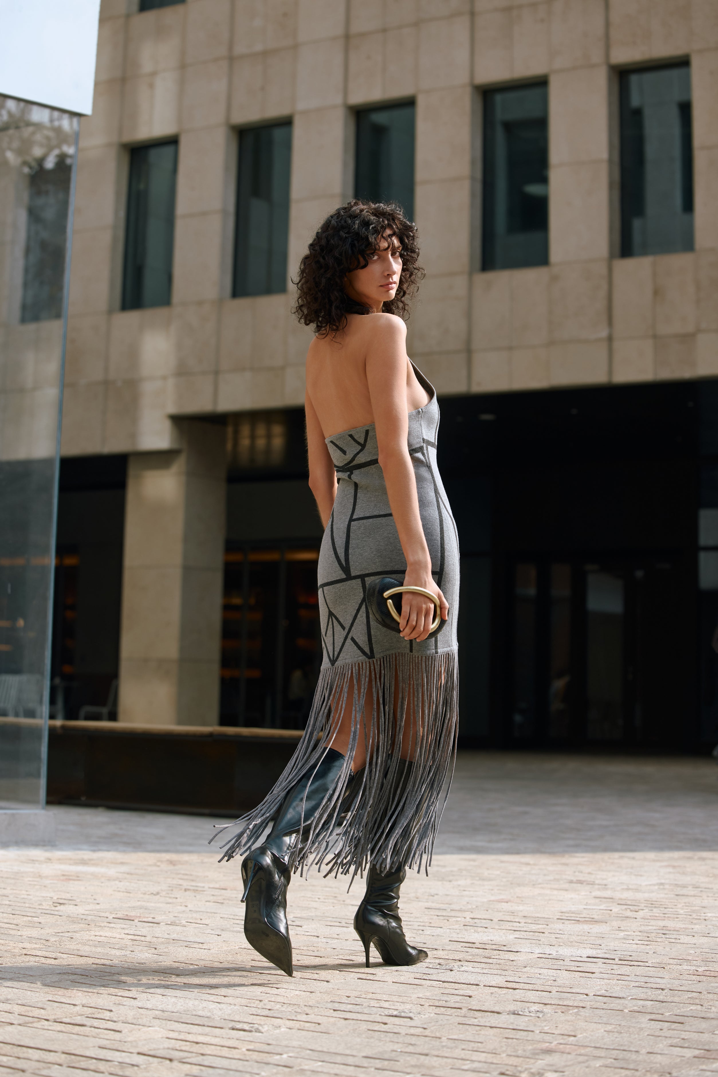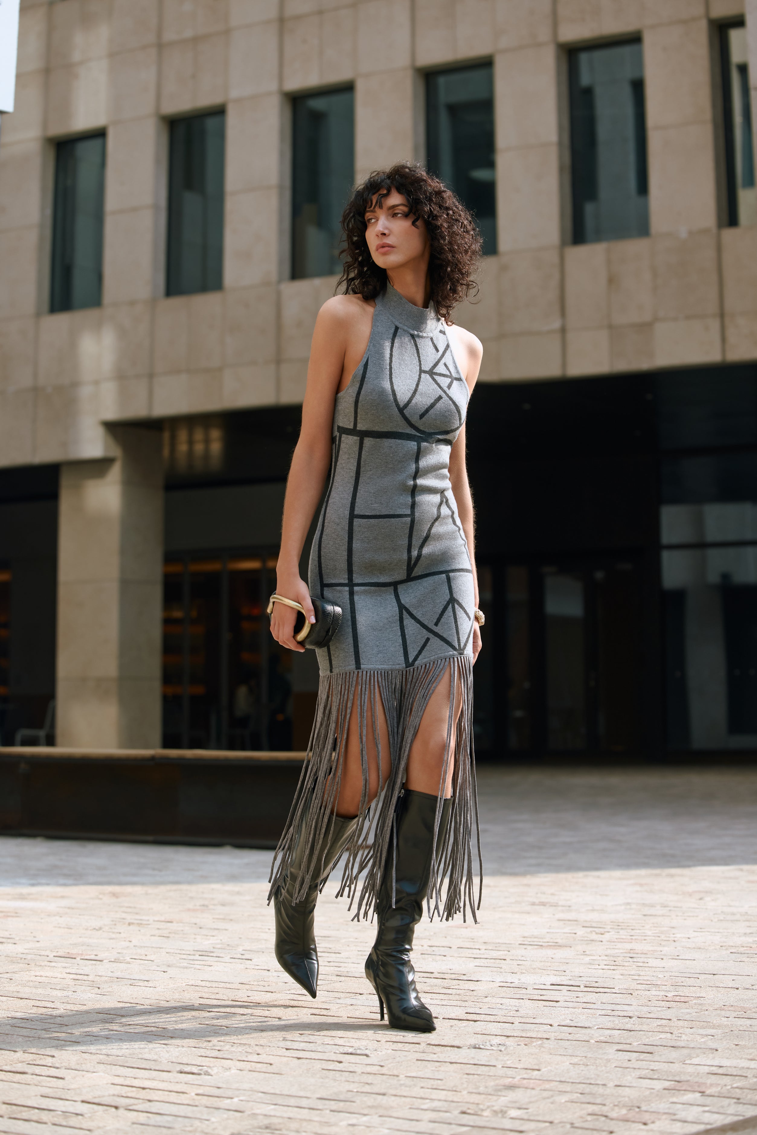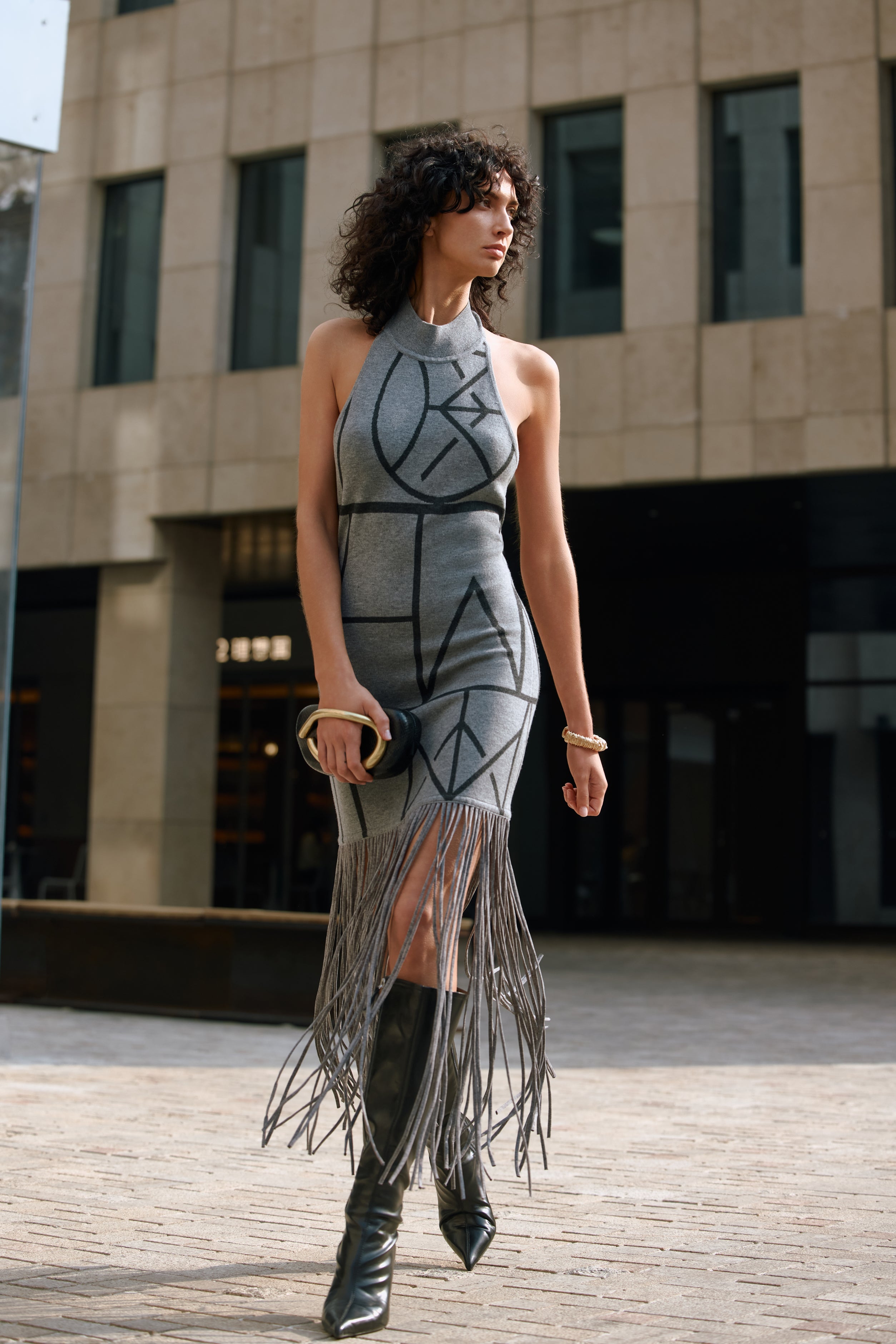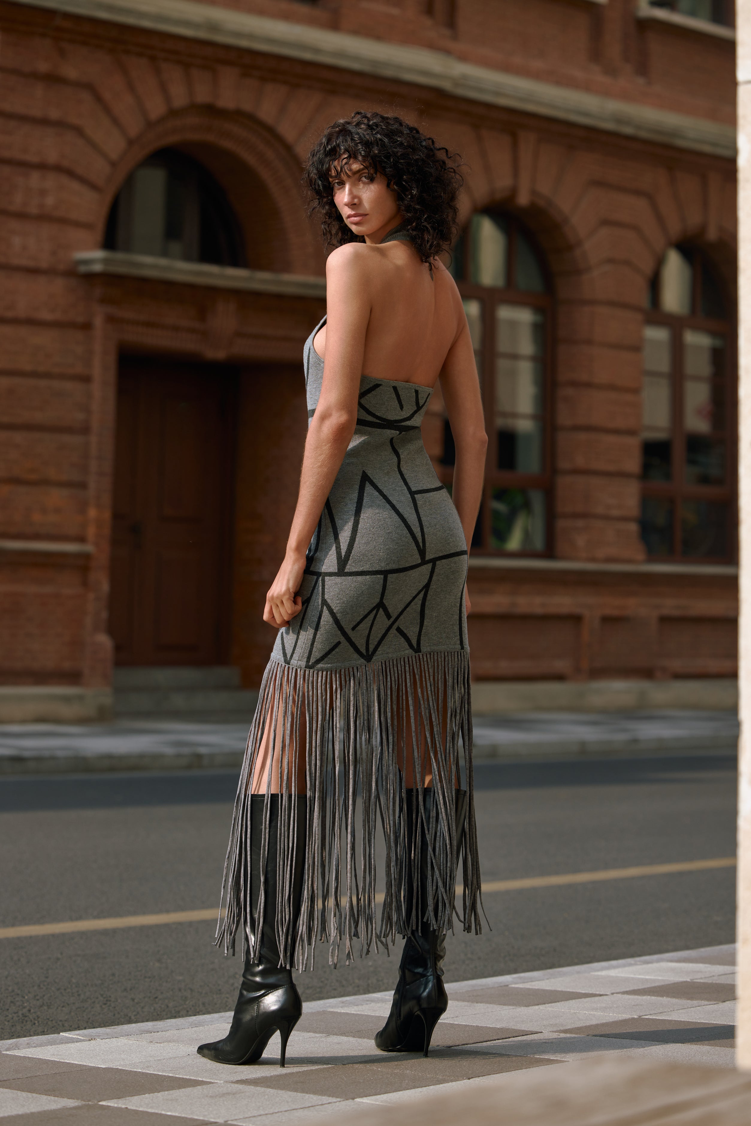 Crafted in a mid-weight wool knit, this dress makes a dynamic statement with its bold geometric pattern and a long fringe hem that dances with every step, blending structure with captivating movement.
