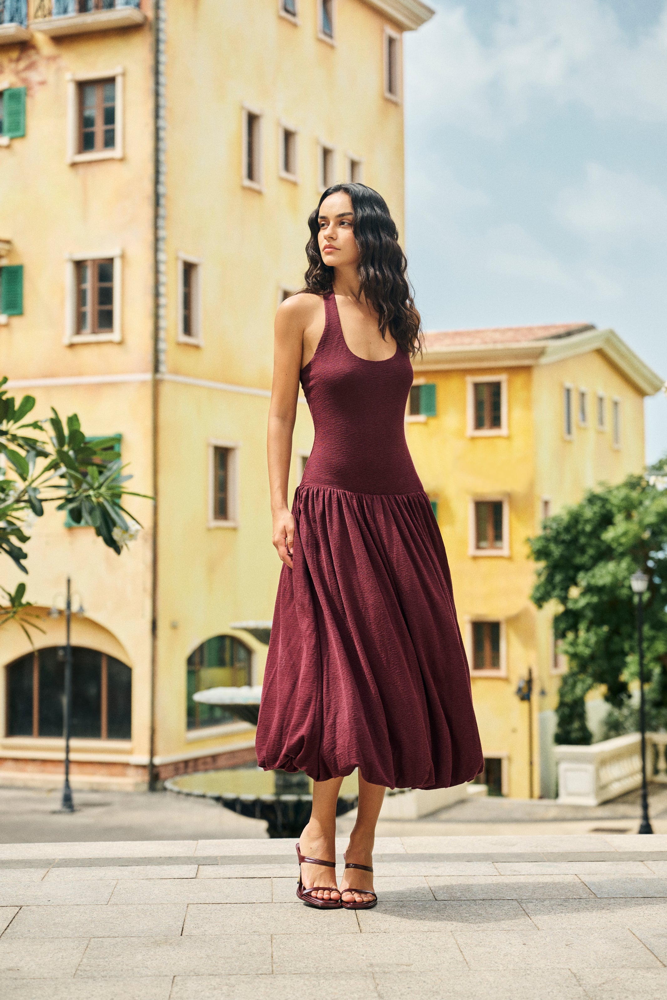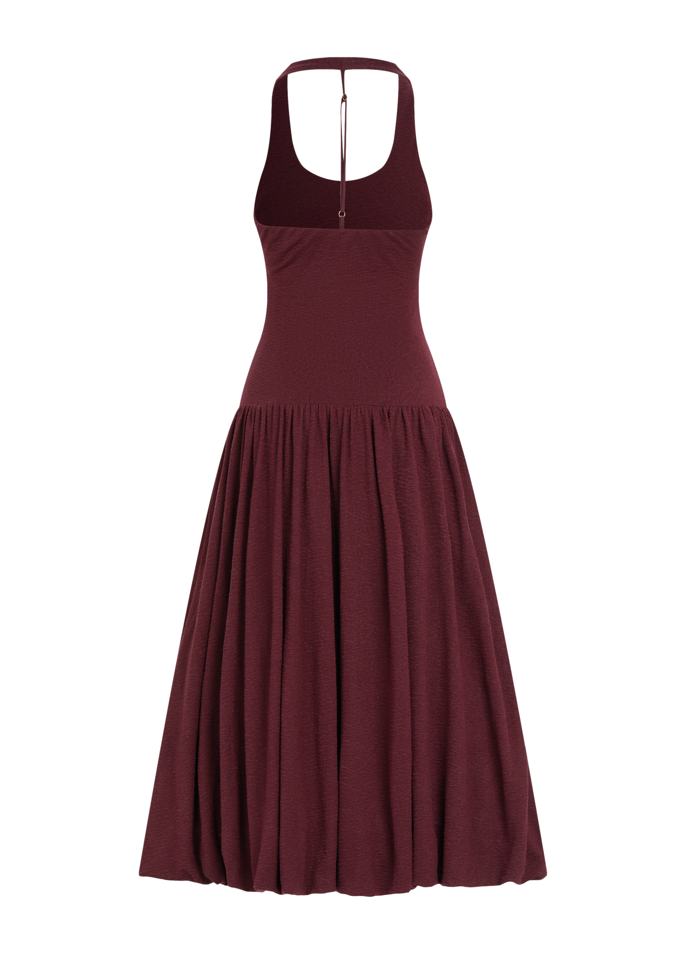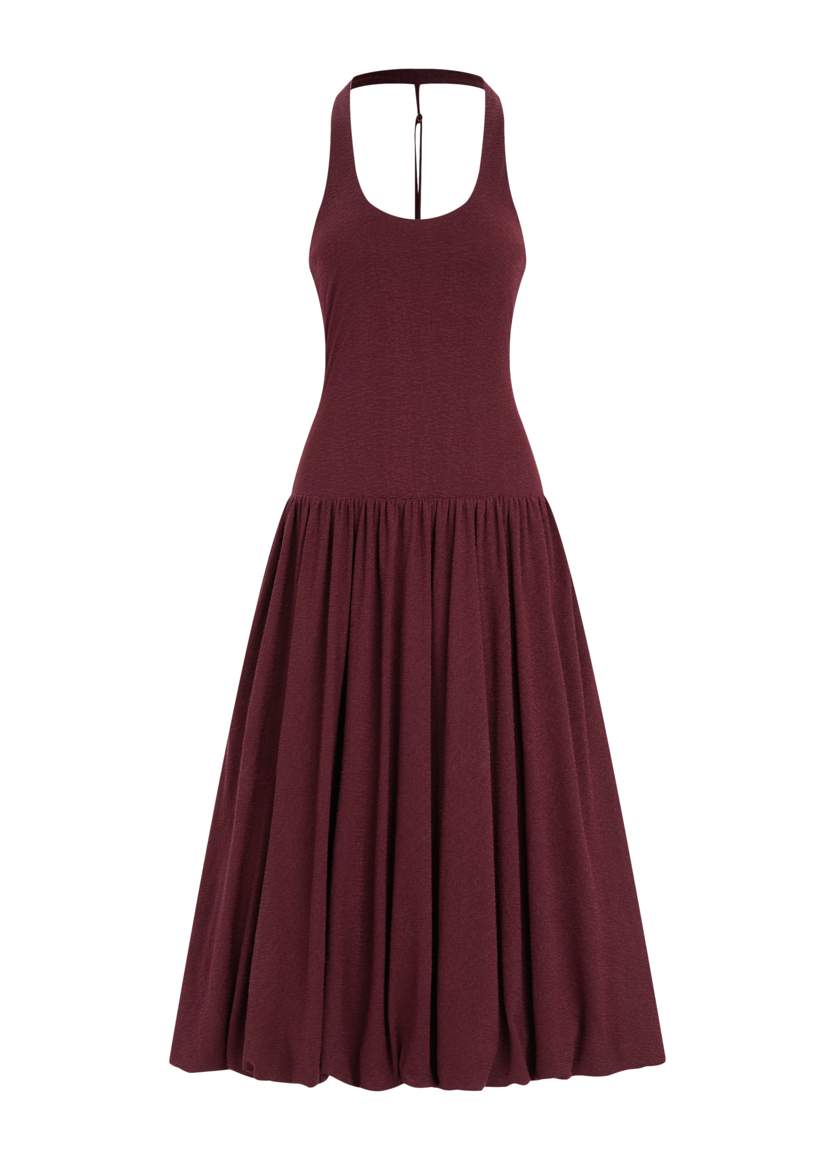 Designed with a tie‑back halter neck and a flattering open back, this midi dress features a fitted bodice that flows into a softly pleated skirt with a voluminous bubble hem. The combination of structure and whimsy creates a silhouette that feels both modern and effortlessly feminine.