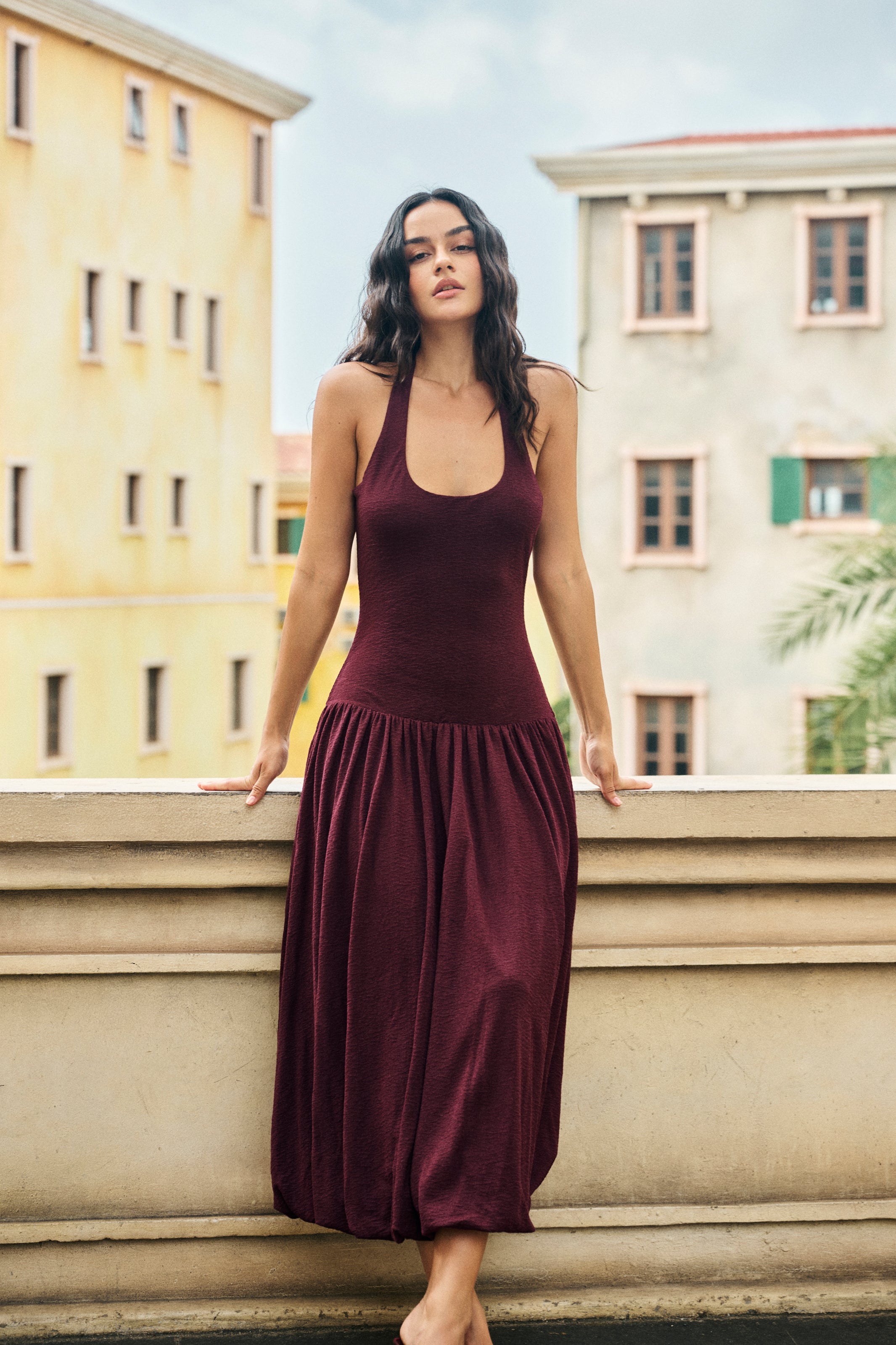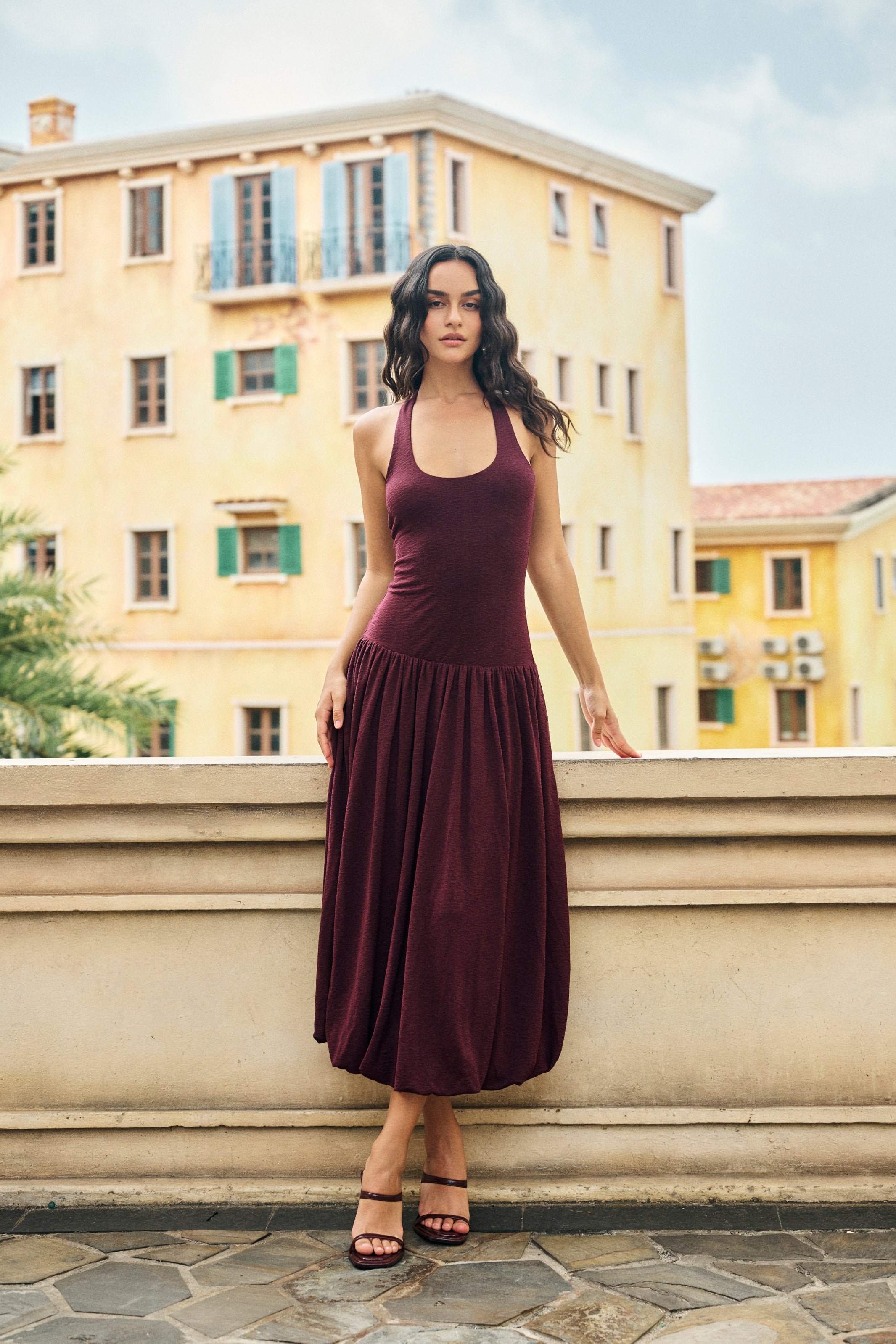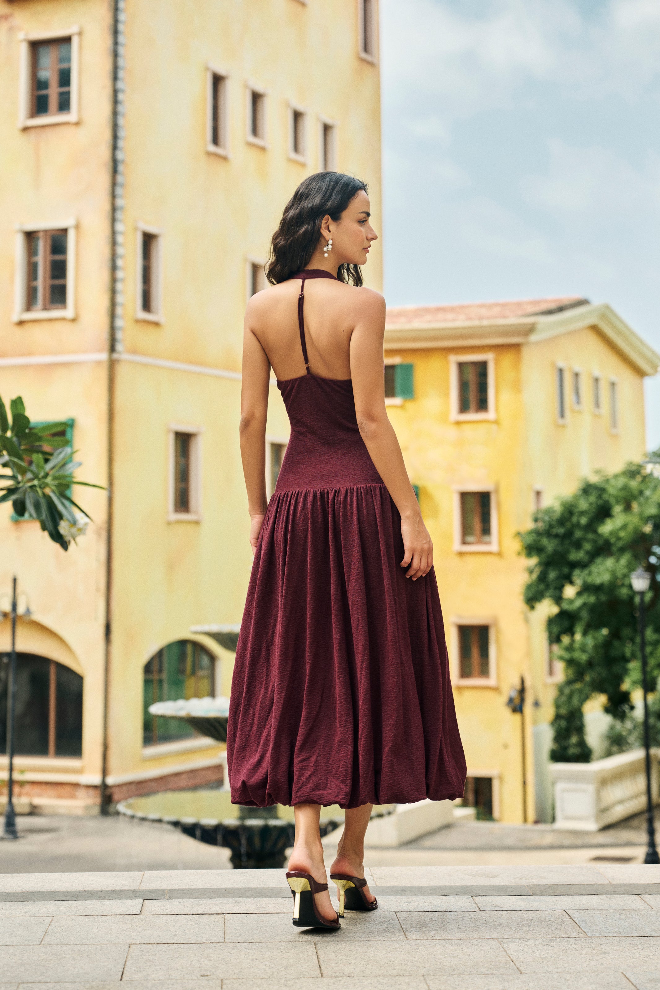 Designed with a tie‑back halter neck and a flattering open back, this midi dress features a fitted bodice that flows into a softly pleated skirt with a voluminous bubble hem. The combination of structure and whimsy creates a silhouette that feels both modern and effortlessly feminine.
