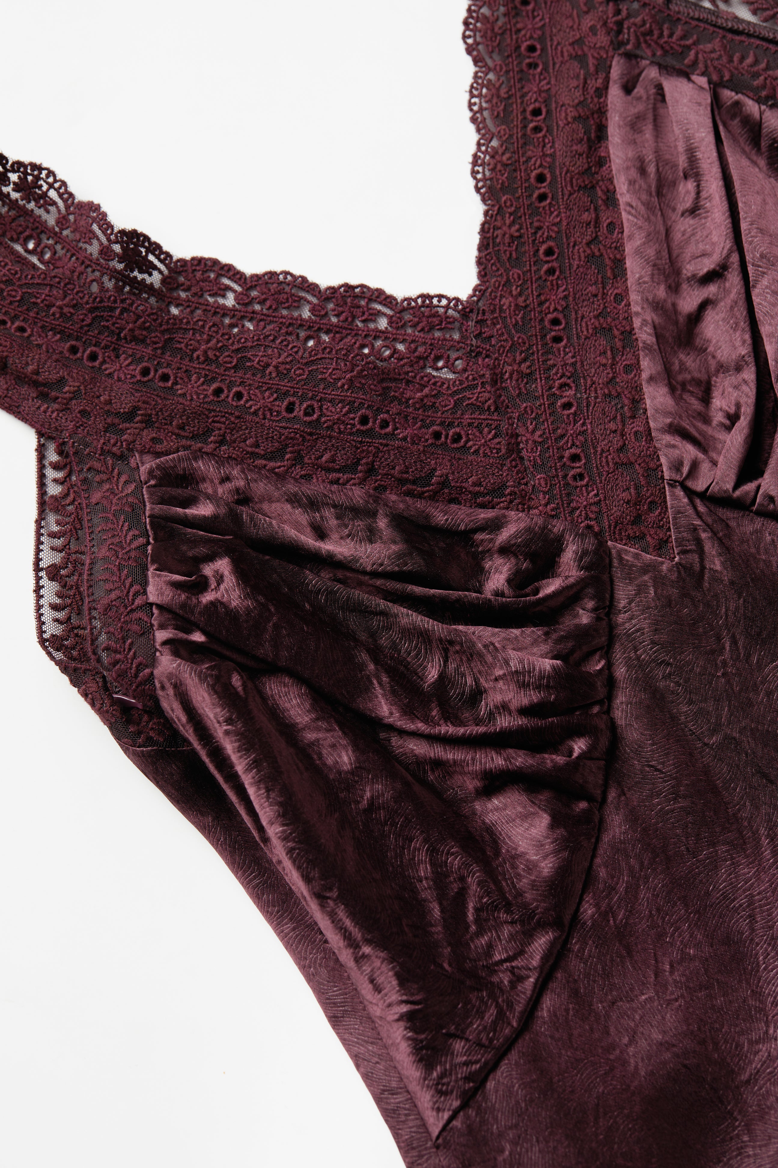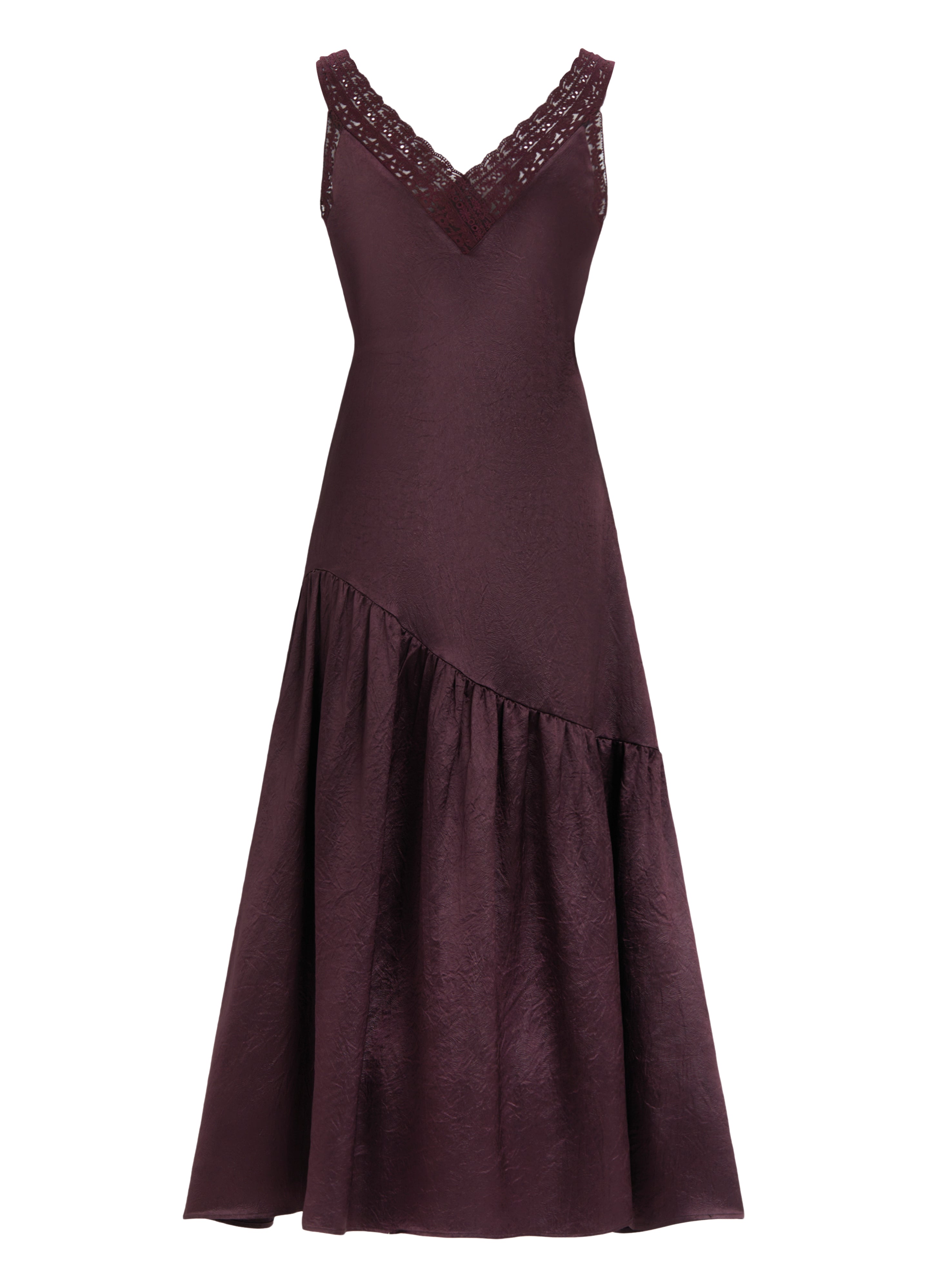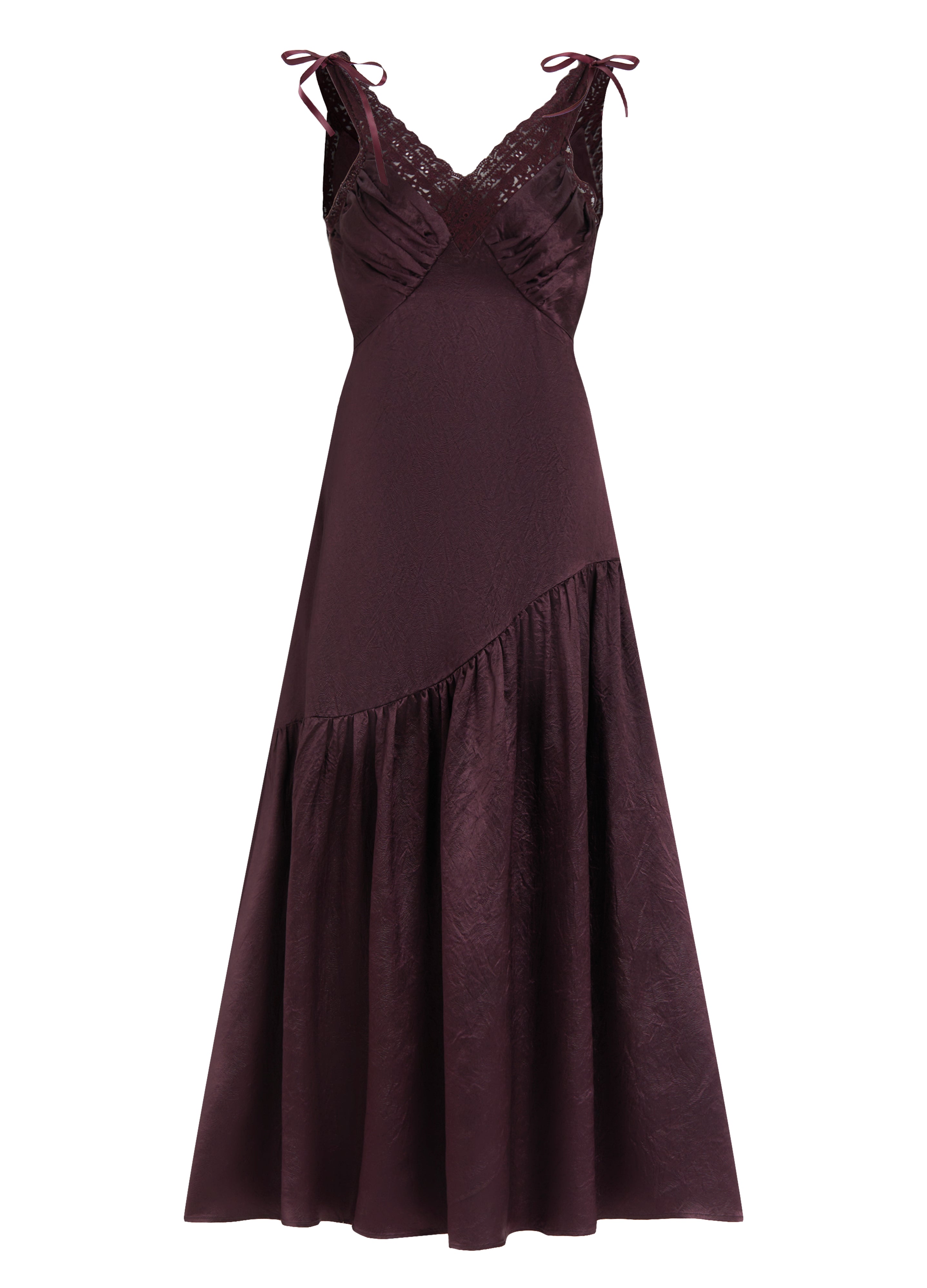 Designed with a V-neck accented by scalloped lace trim and subtle ruching at the bust, this maxi dress features an asymmetrical flare skirt that moves beautifully with every step. The lace straps add a delicate finishing touch, making it an effortless choice for evening soirées.