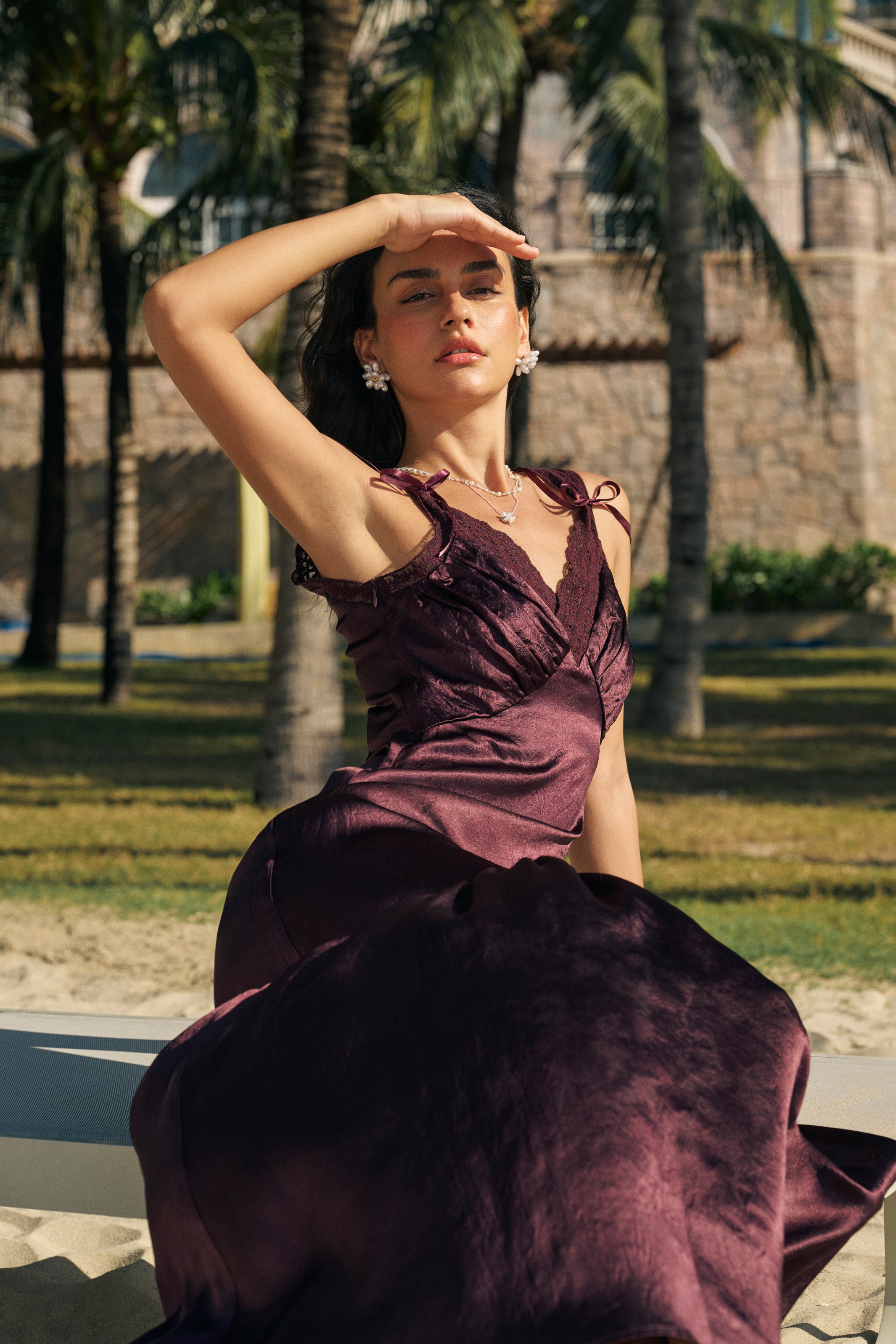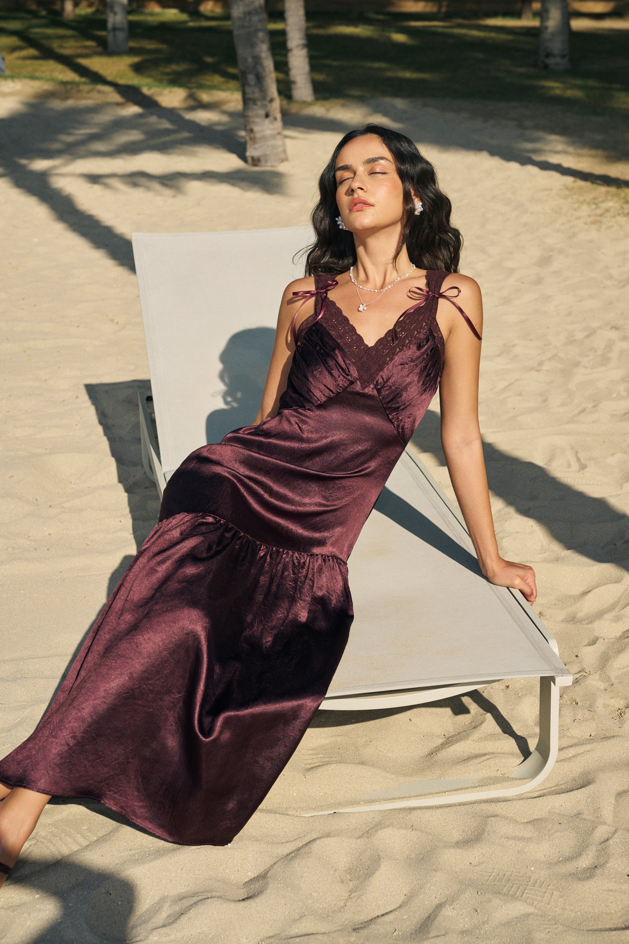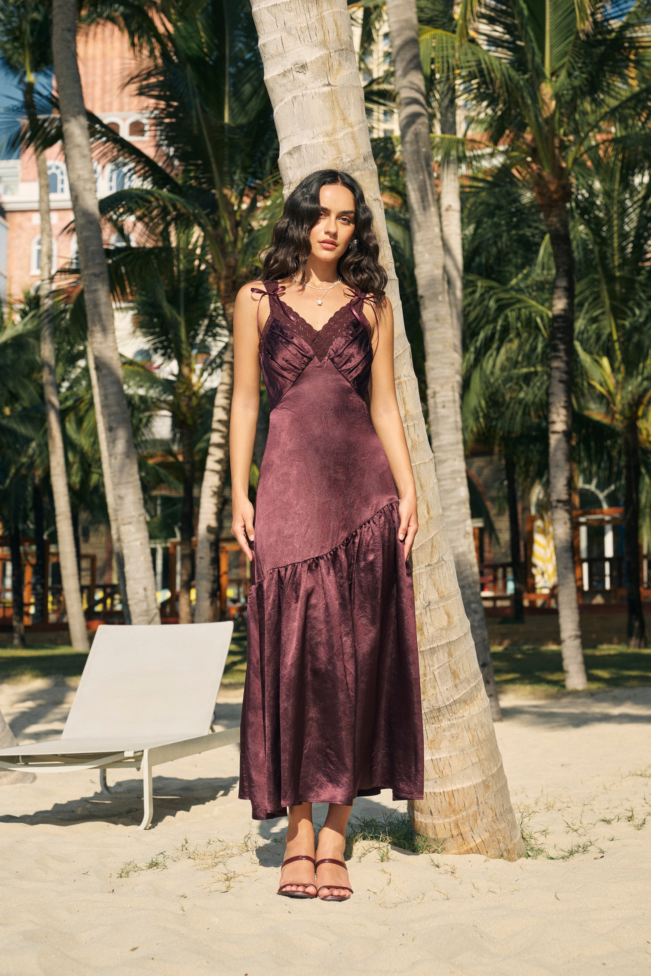 Designed with a V-neck accented by scalloped lace trim and subtle ruching at the bust, this maxi dress features an asymmetrical flare skirt that moves beautifully with every step. The lace straps add a delicate finishing touch, making it an effortless choice for evening soirées.