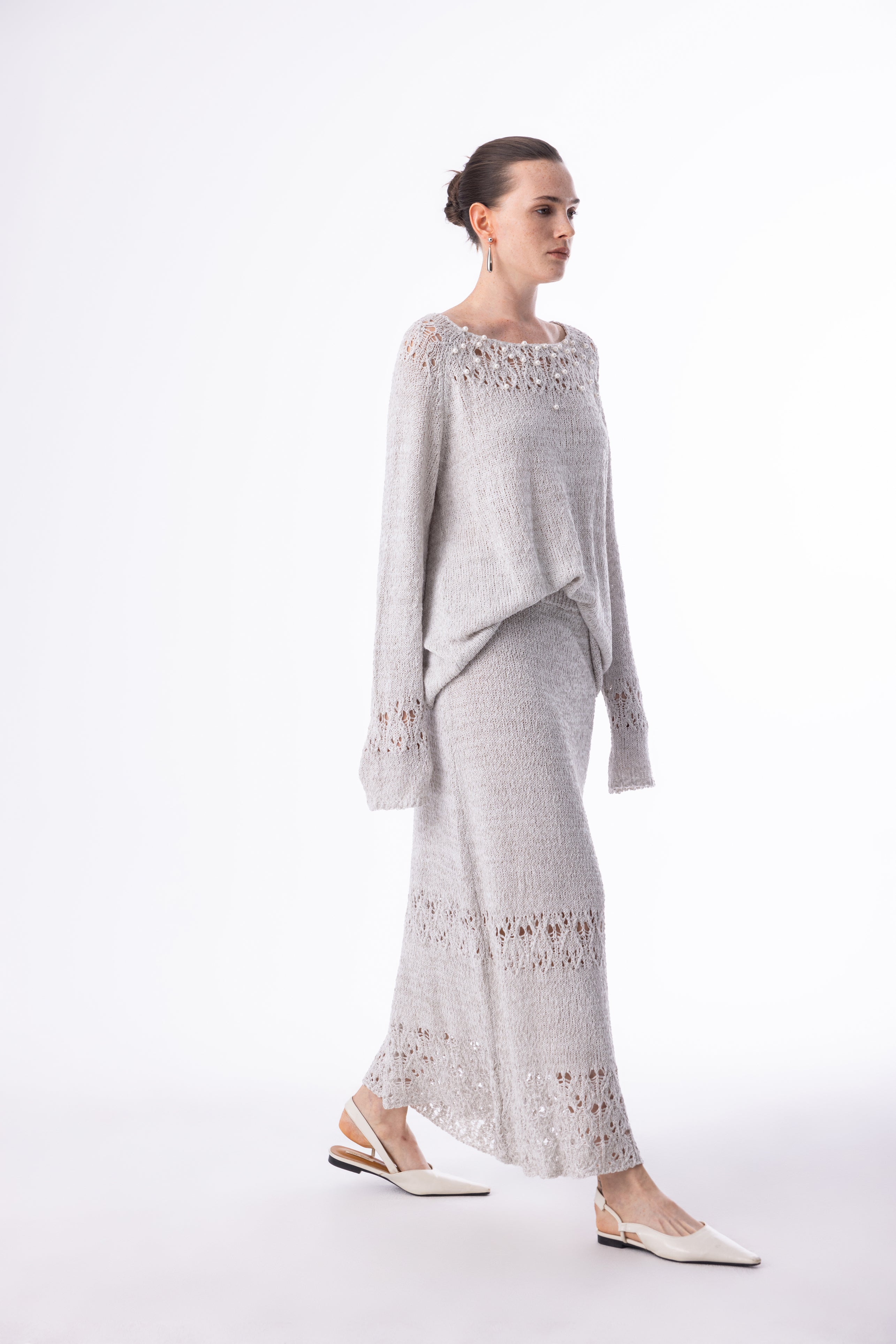 Crafted in a lightweight, openwork knit, this pearl-adorned sweater offers breathable comfort and a relaxed silhouette. It’s a piece designed to feel special, yet easy enough to wear all day long. Complete the look by pairing it with our matching lightweight openwork maxi skirt for an effortlessly elegant ensemble.