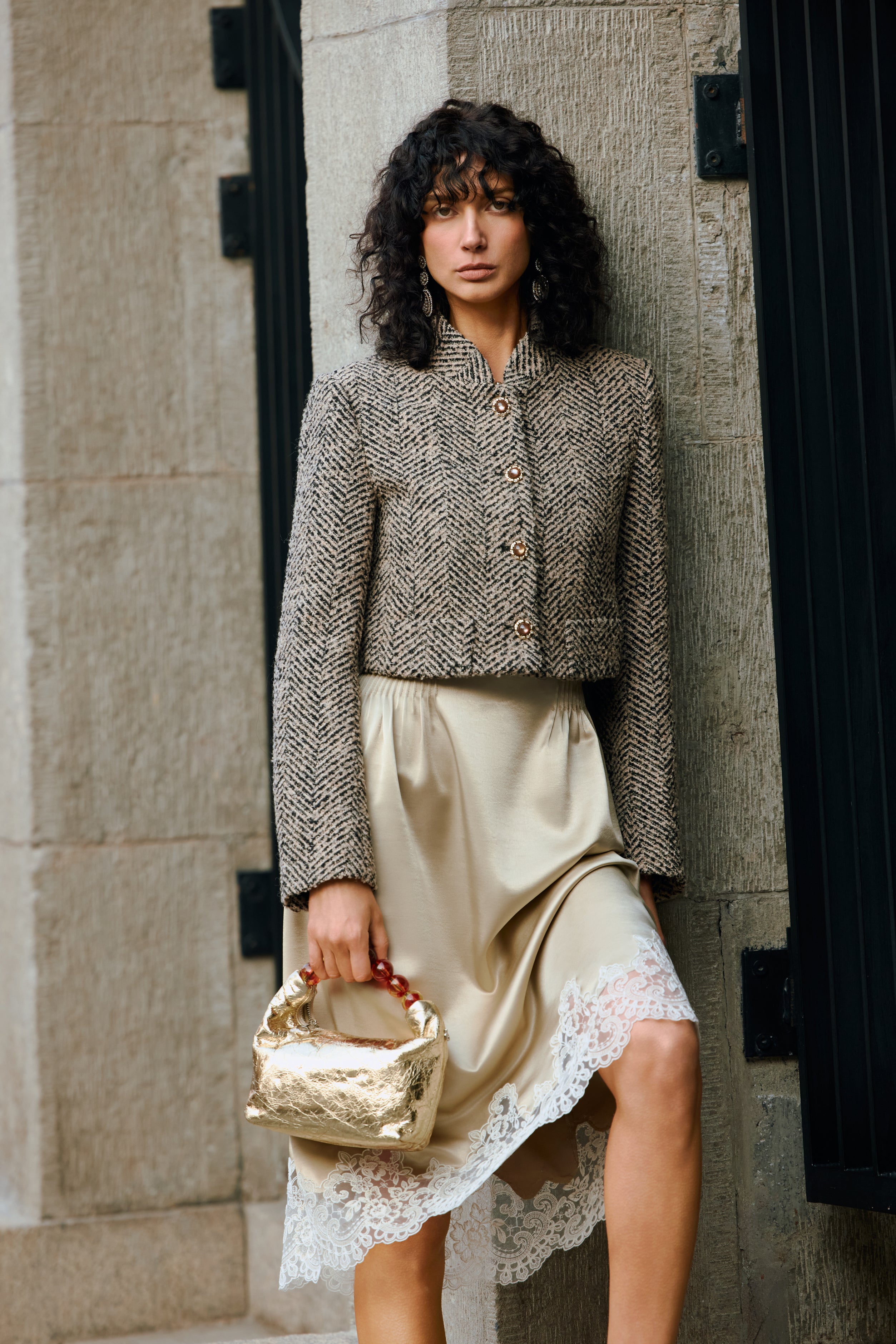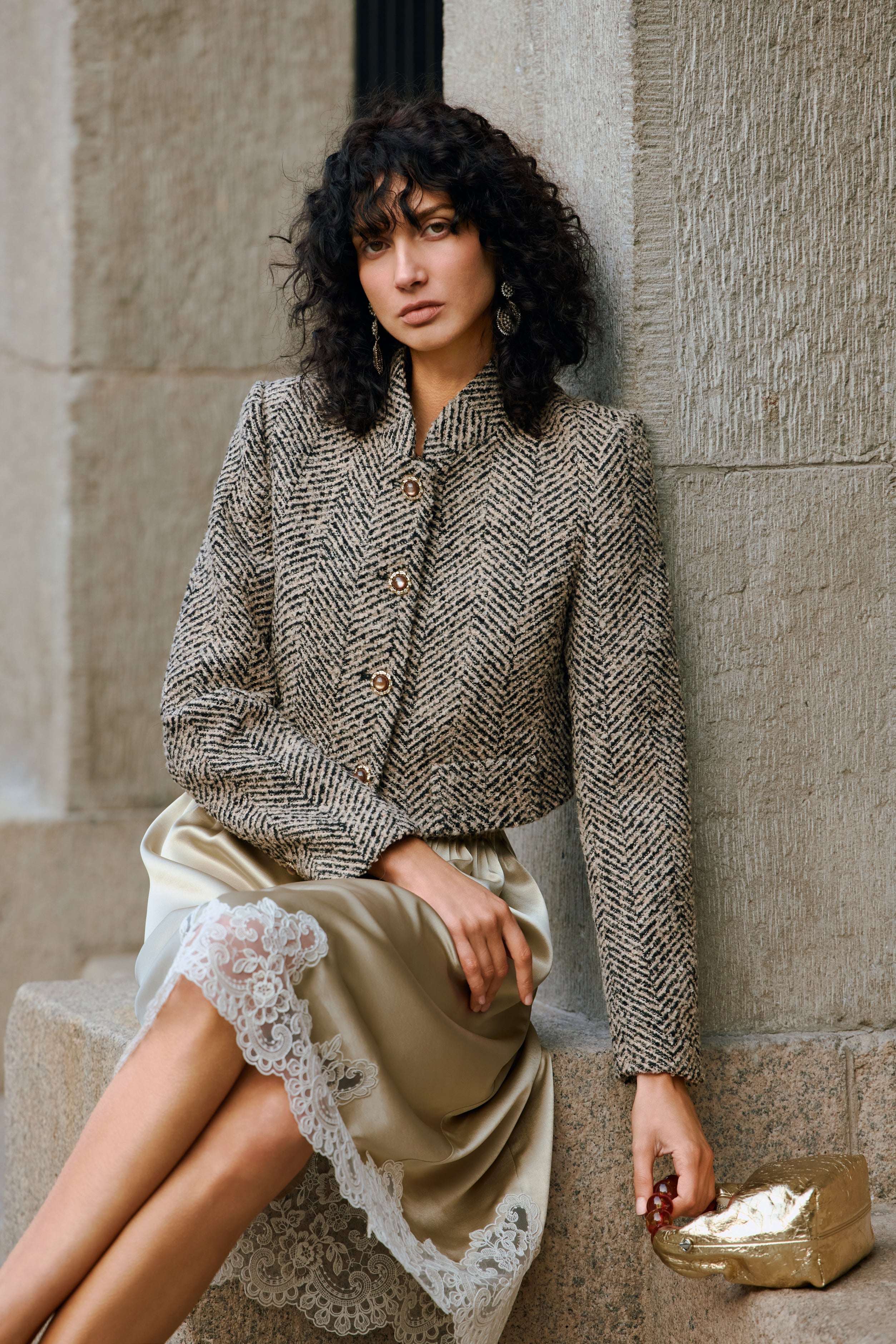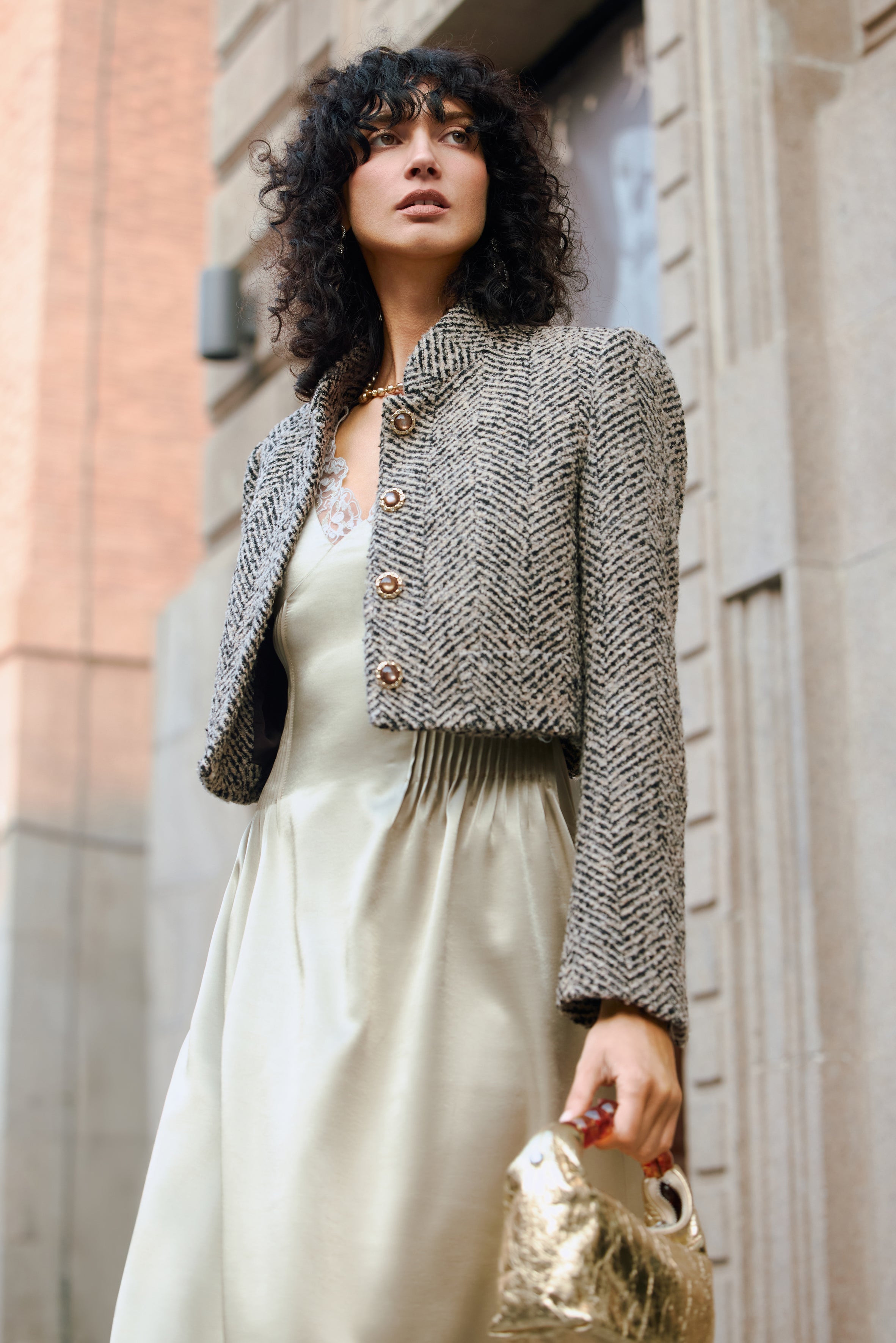 Sculpt your silhouette with this crisply tailored cropped jacket. The stand collar and full button placket lend a polished structure, making it the perfect refined layer to elevate any outfit instantly.