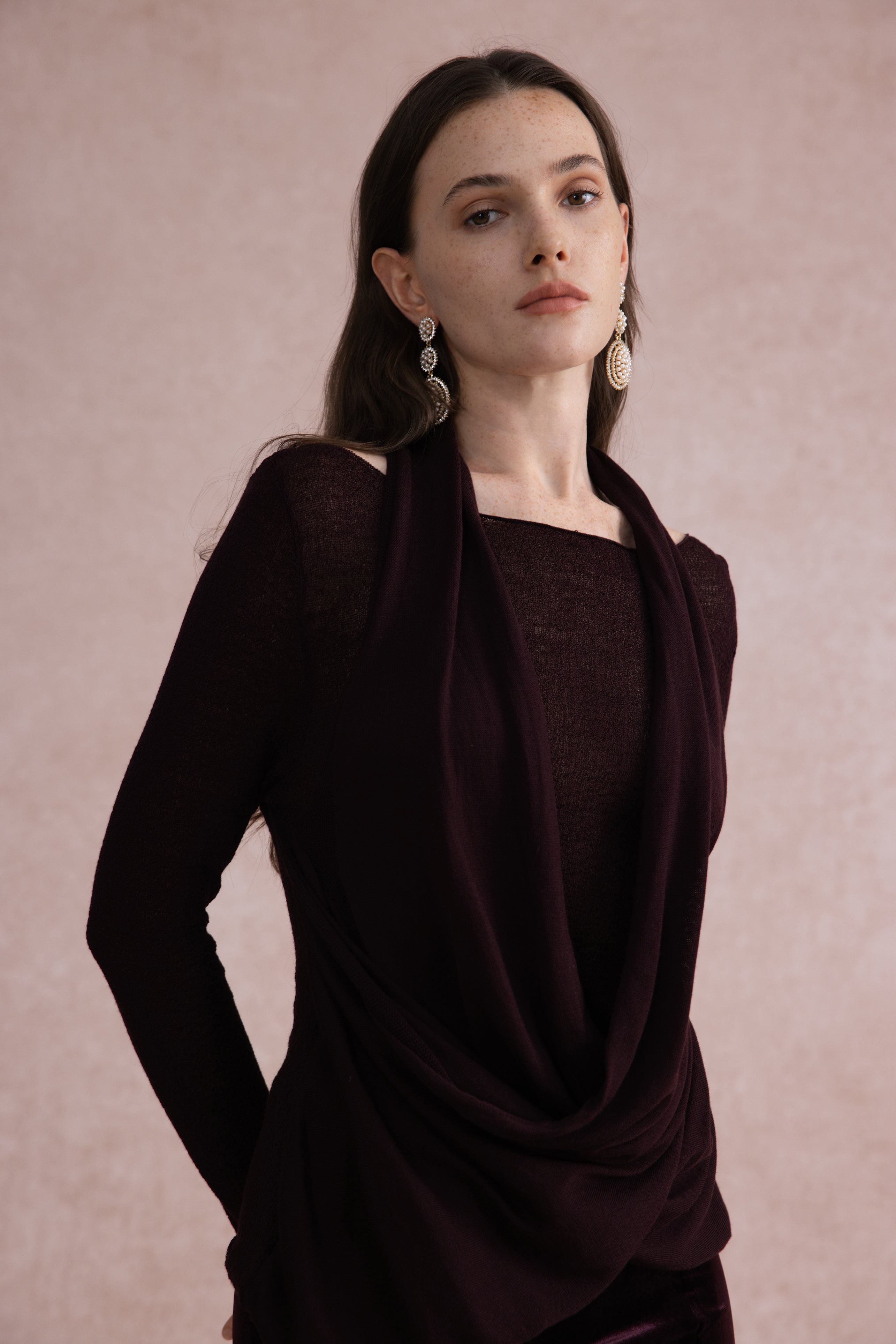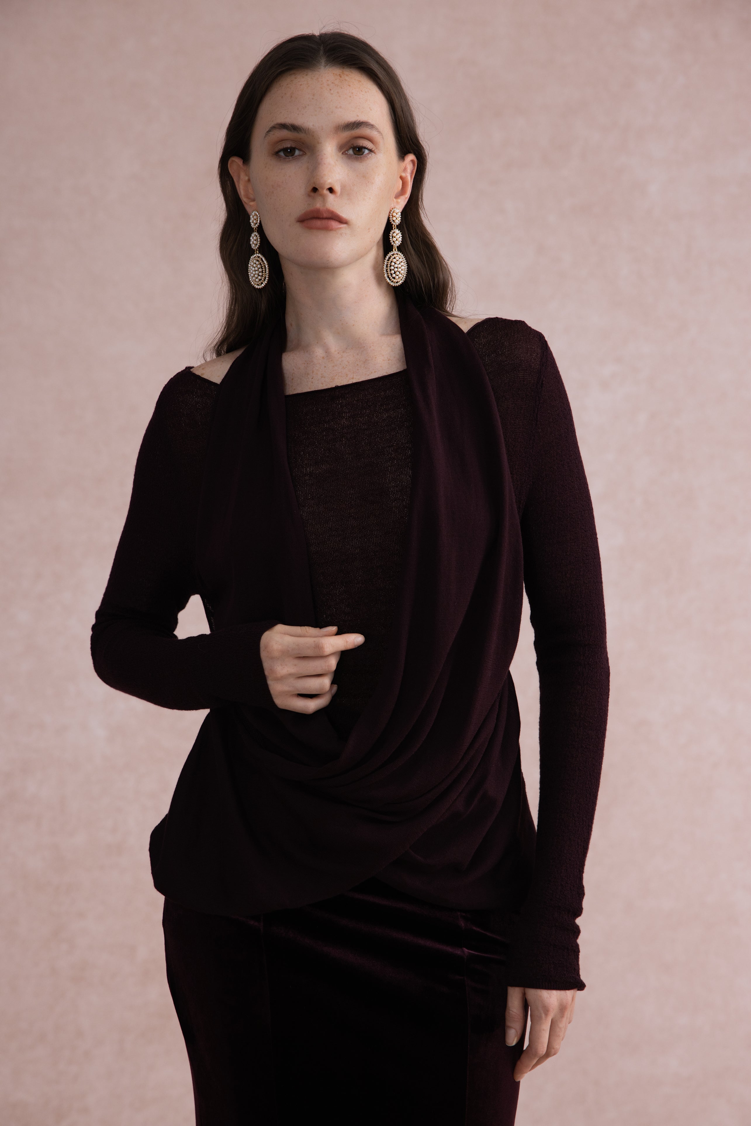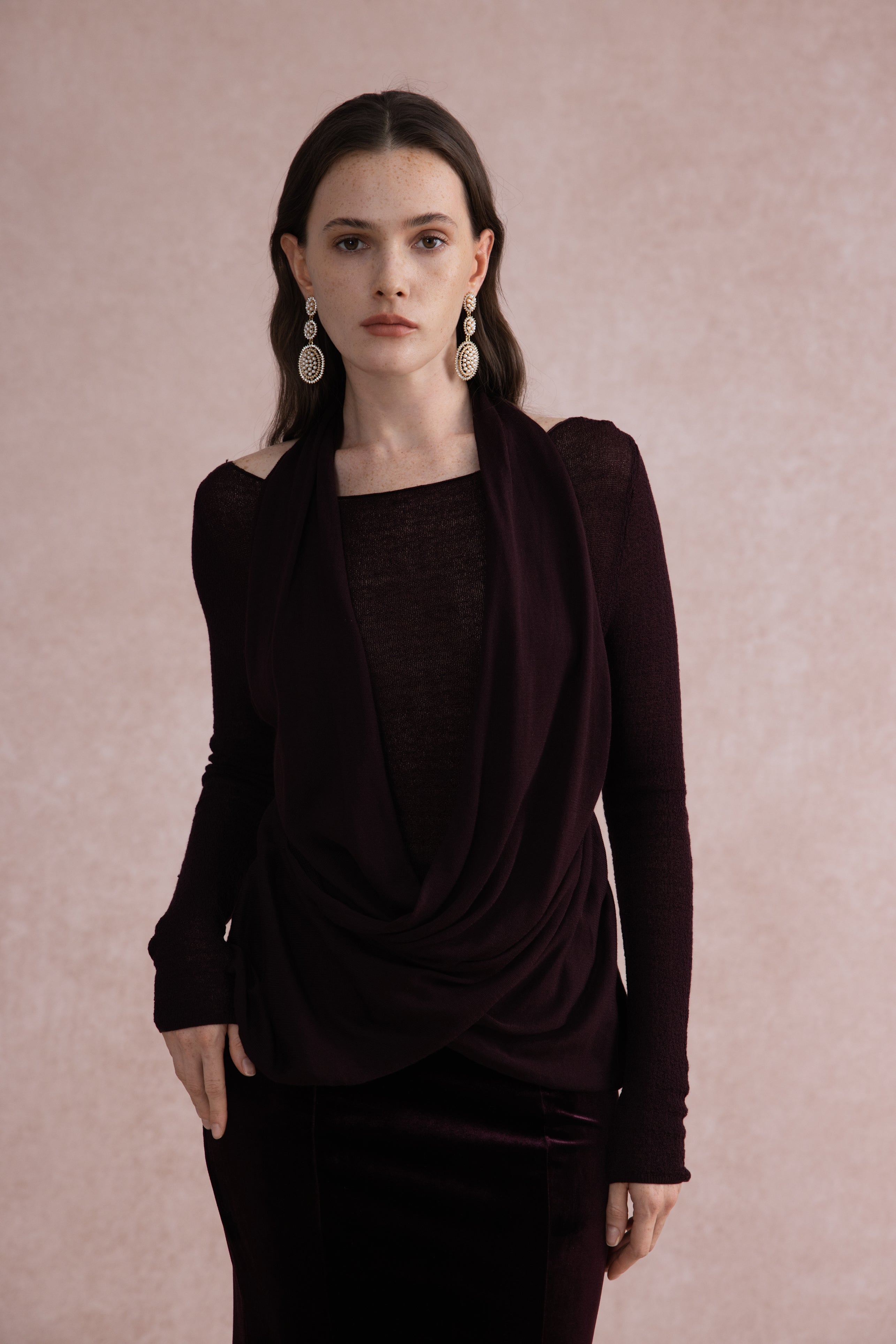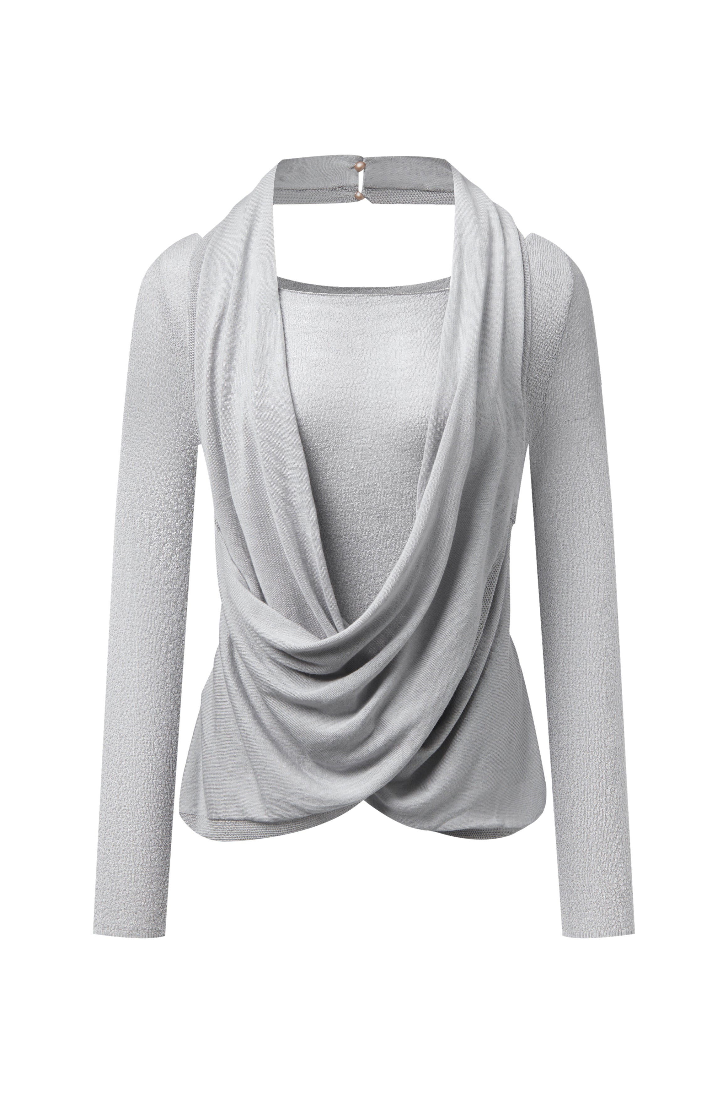 This unique knit top features a double-layer halterneck design. An additional cross-over front panel creates soft, intentional draping that elegantly cascades toward the waist, offering a flattering and dynamic silhouette.