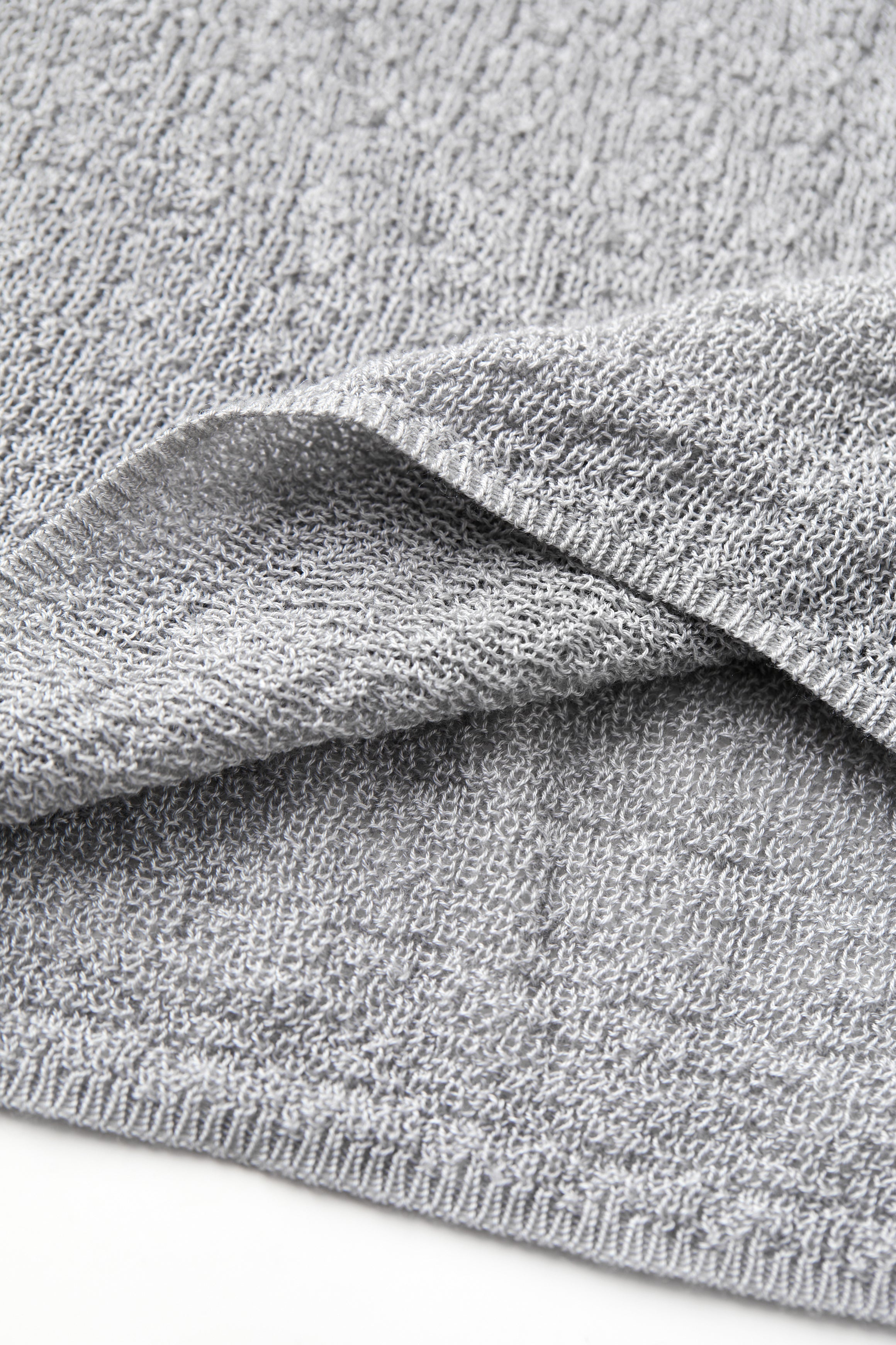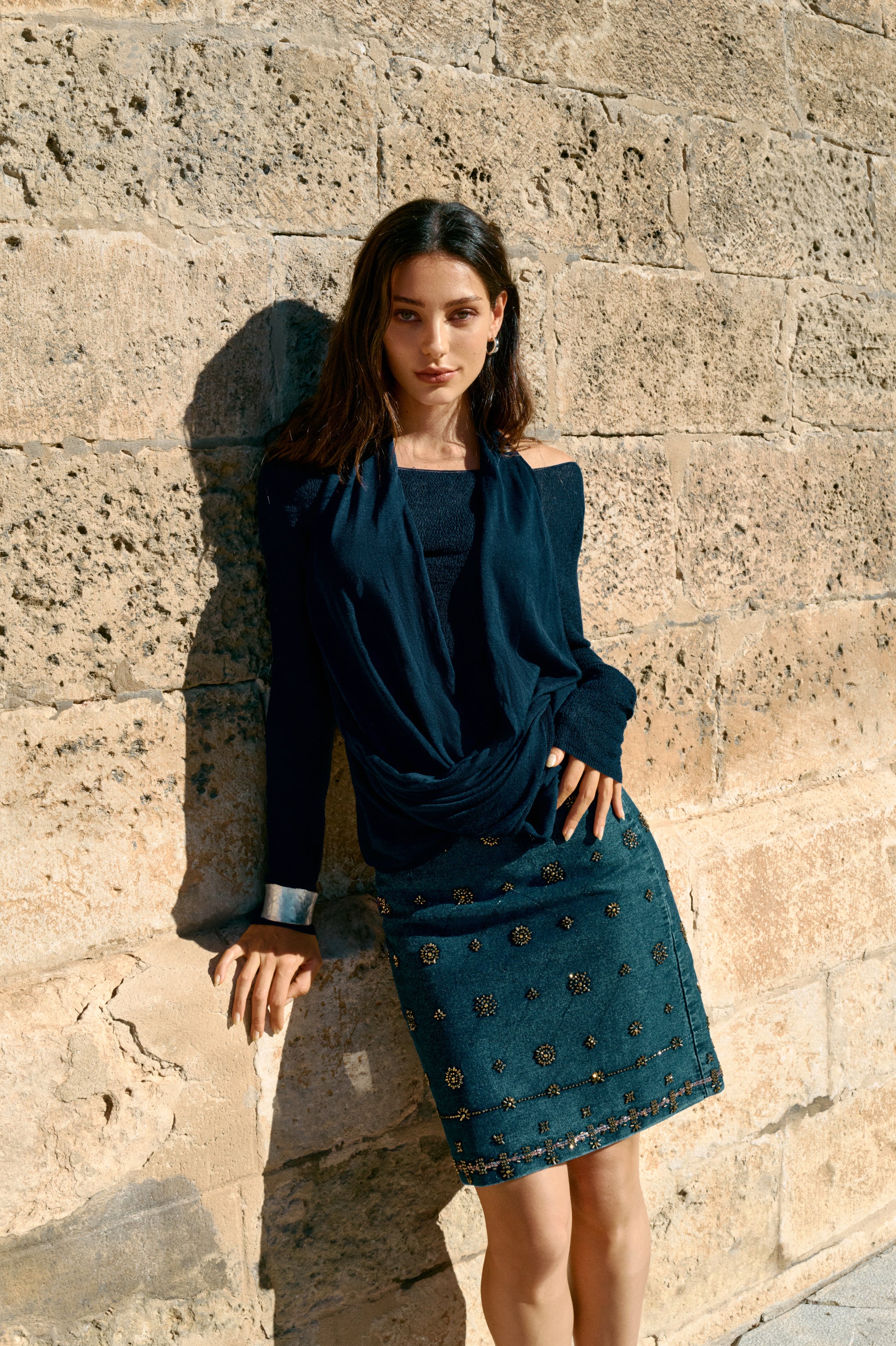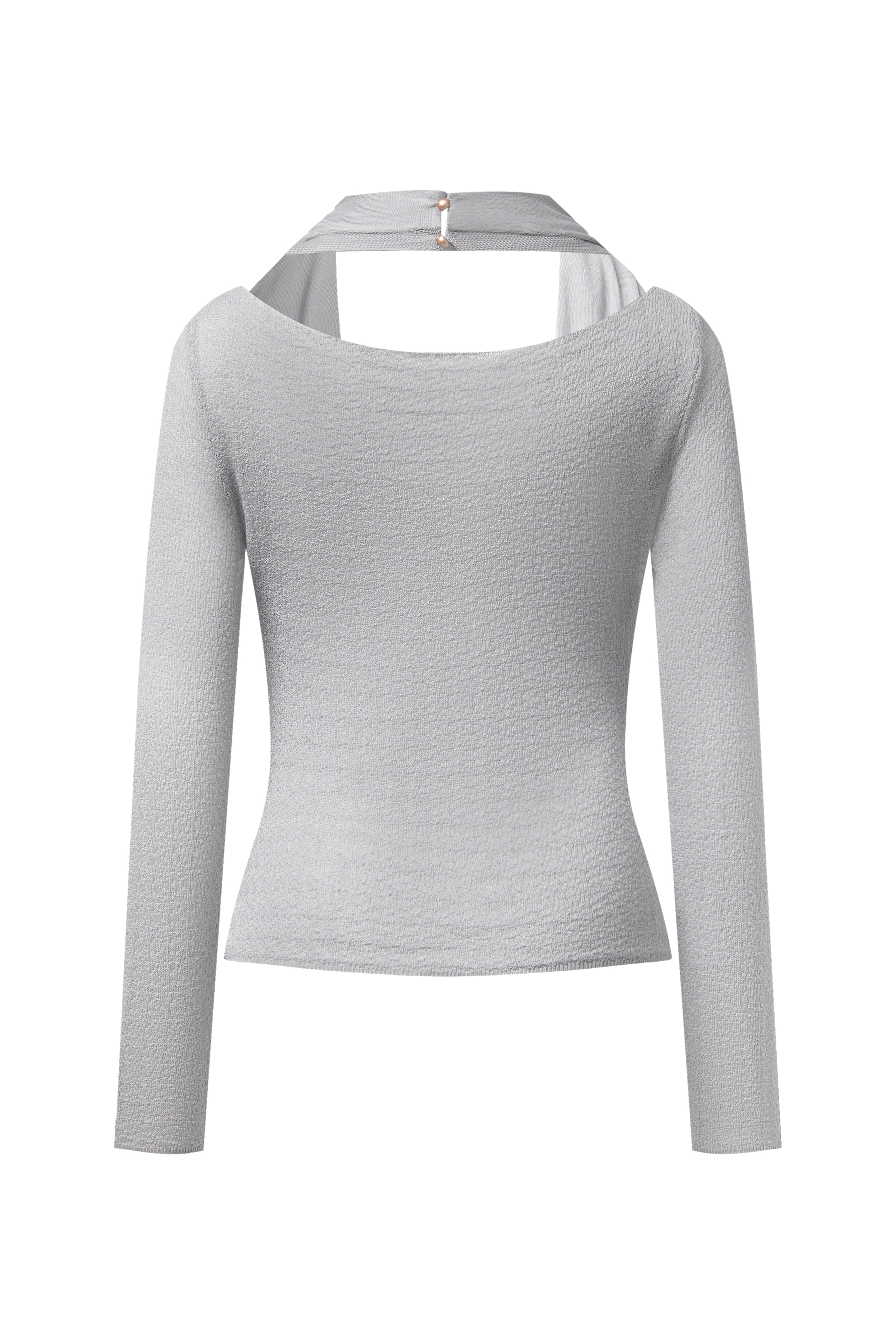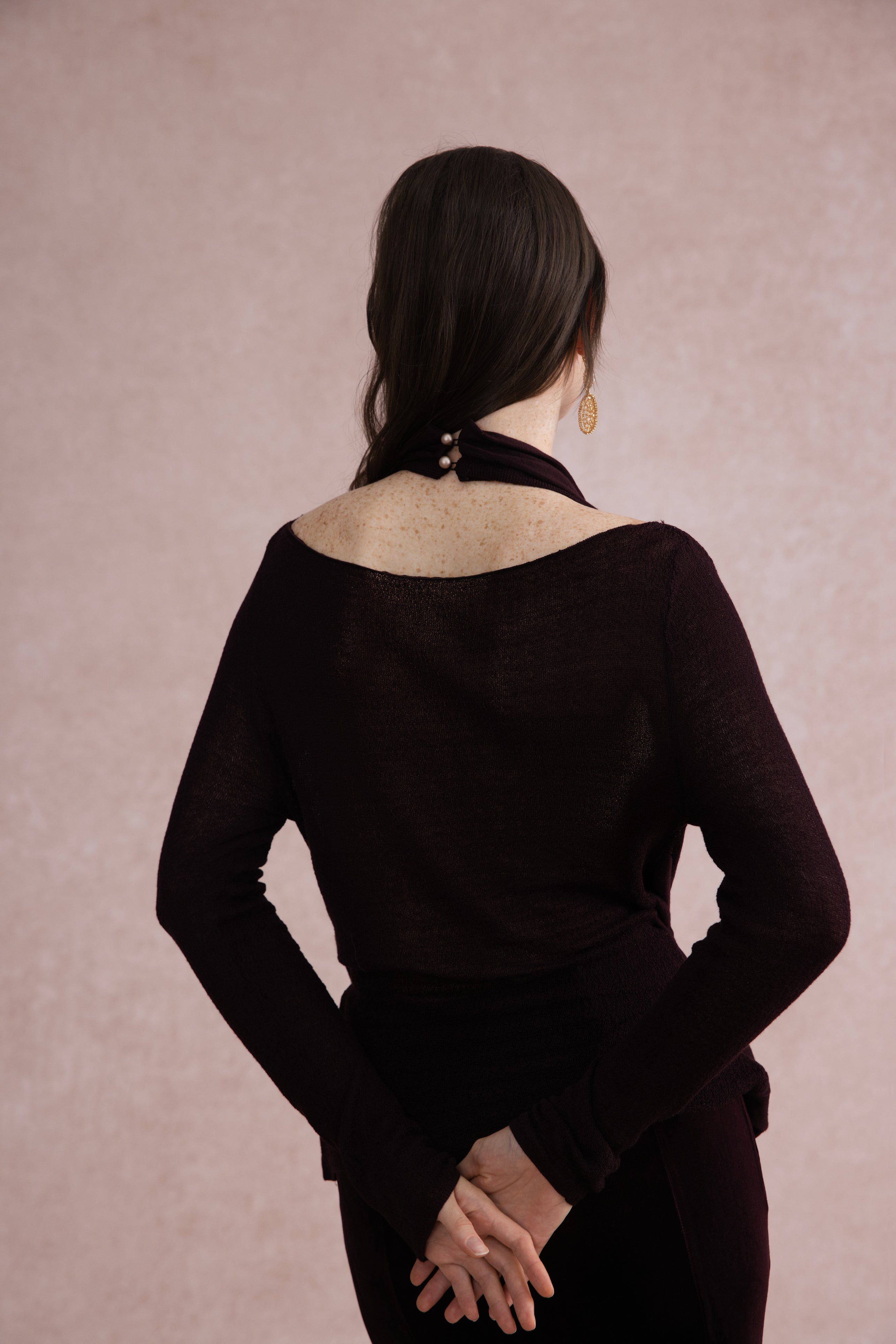 This unique knit top features a double-layer halterneck design. An additional cross-over front panel creates soft, intentional draping that elegantly cascades toward the waist, offering a flattering and dynamic silhouette.