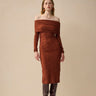 Winter's warmest Hue. Slip into the vibrant, cozy shade with this beautifully crafted off-shoulder dress. The soft floral jacquard fabric softly sculpts the body with its stretch slim fit and easy pull-on design. Perfect for bringing a touch of warmth and elegance to any winter occasion.