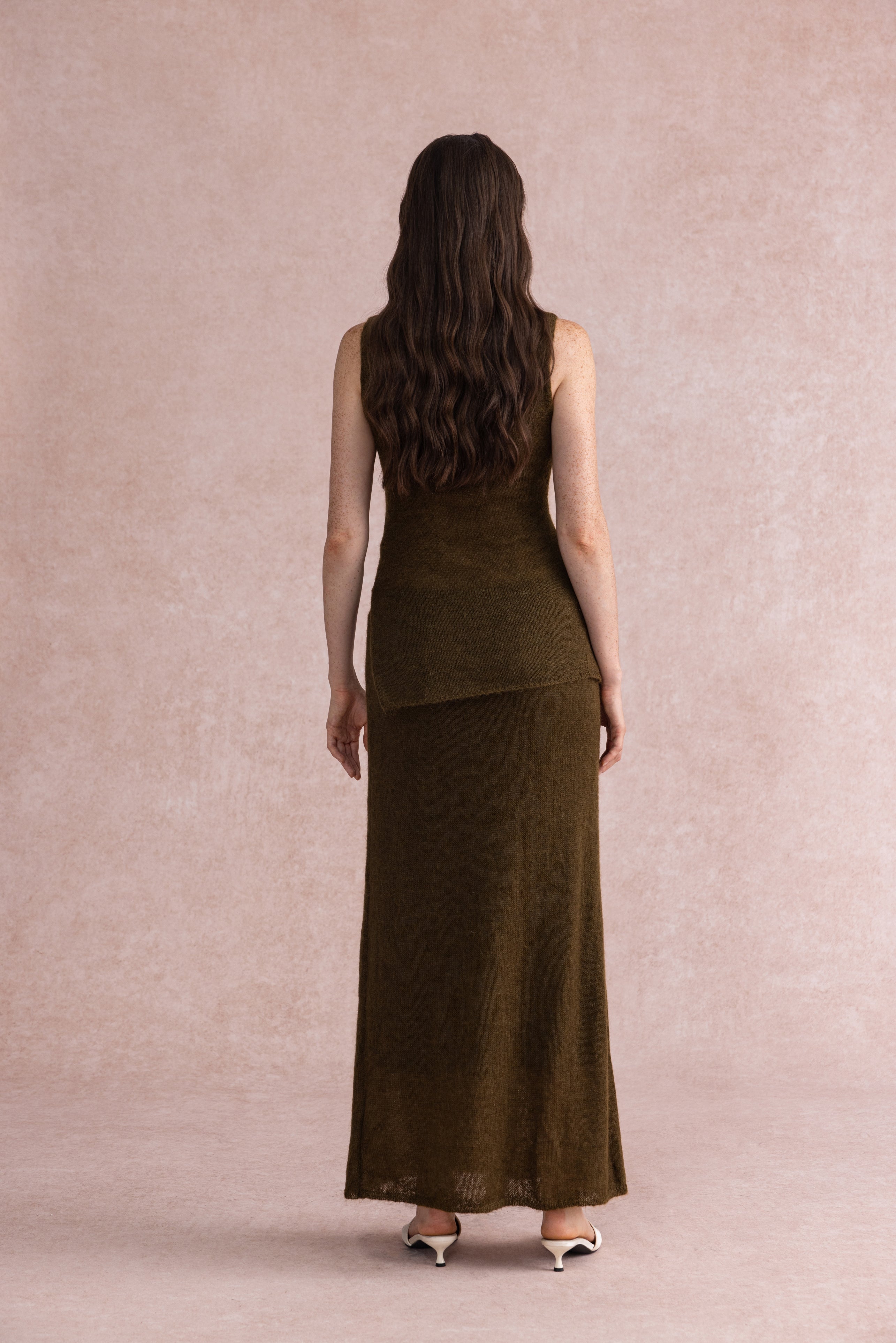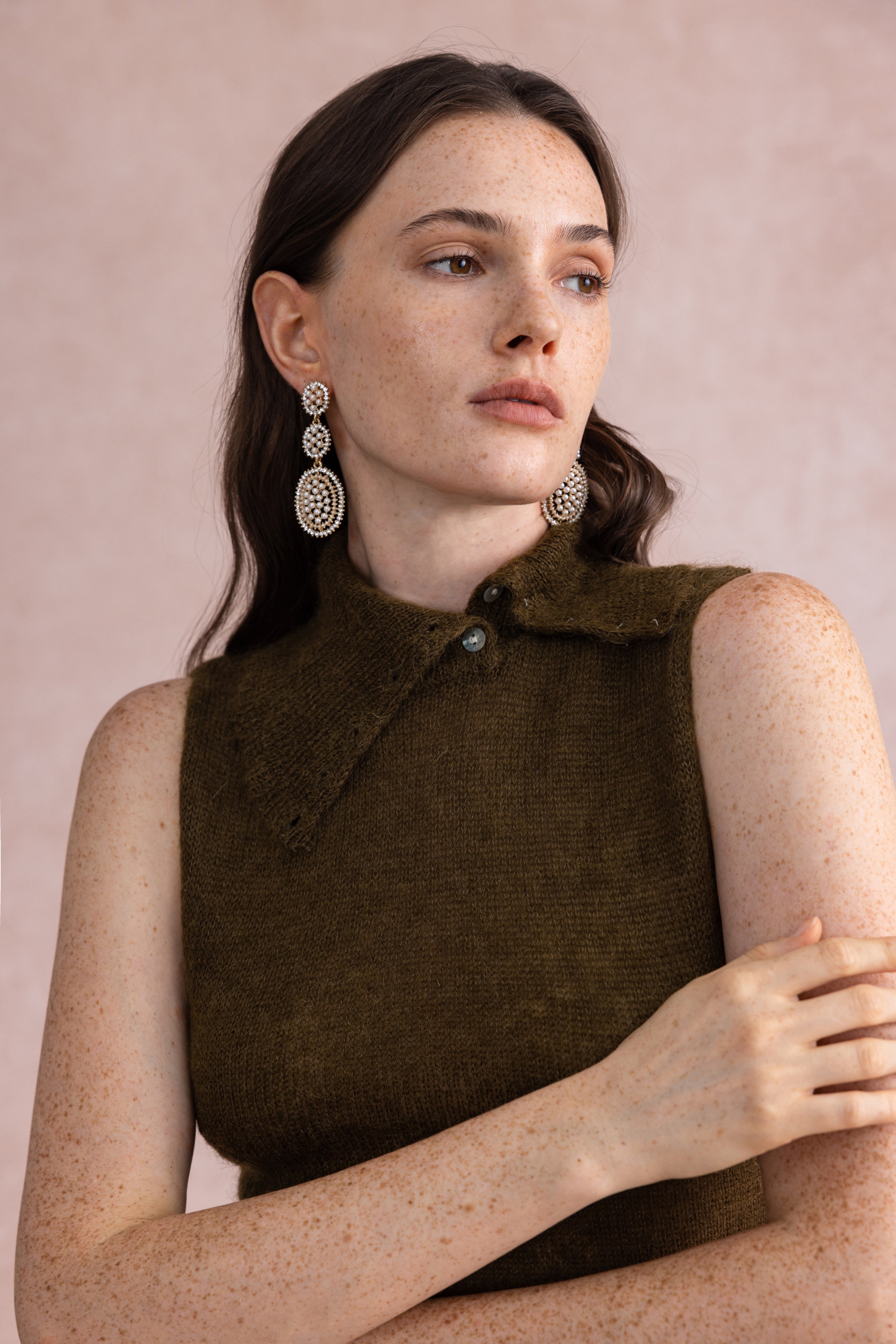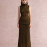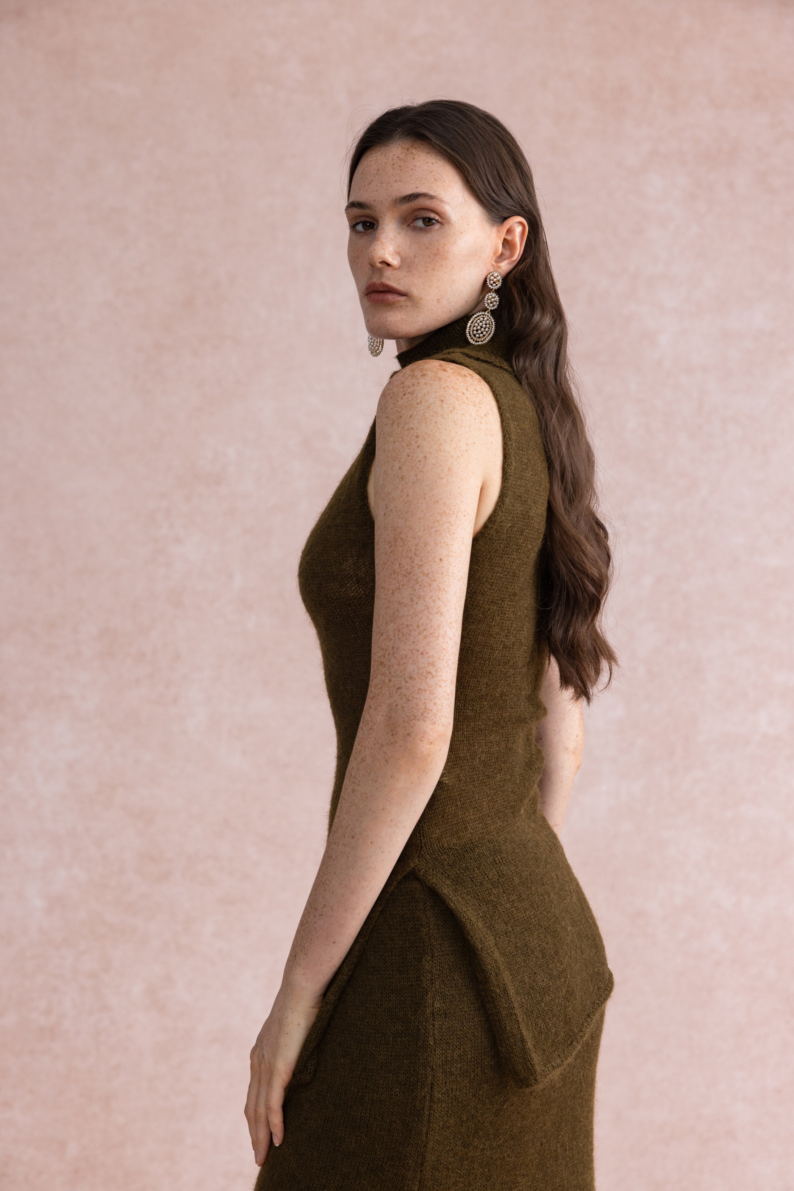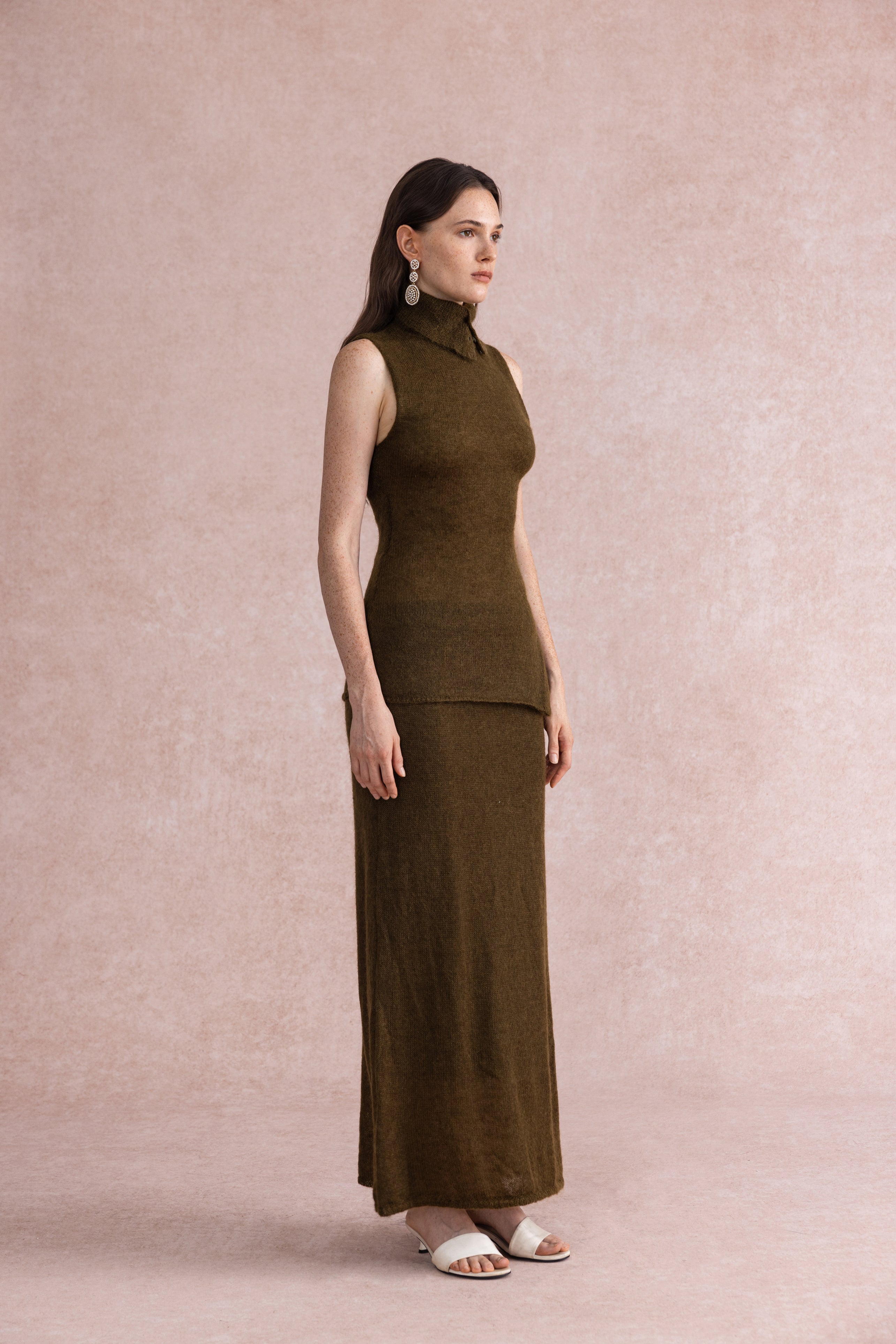 This duo combines a customizable turtleneck top with an elegantly flared skirt for an effortlessly chic look. Easily transform your neckline from a cozy turtleneck to a soft, open drape by simply adjusting the buttons.