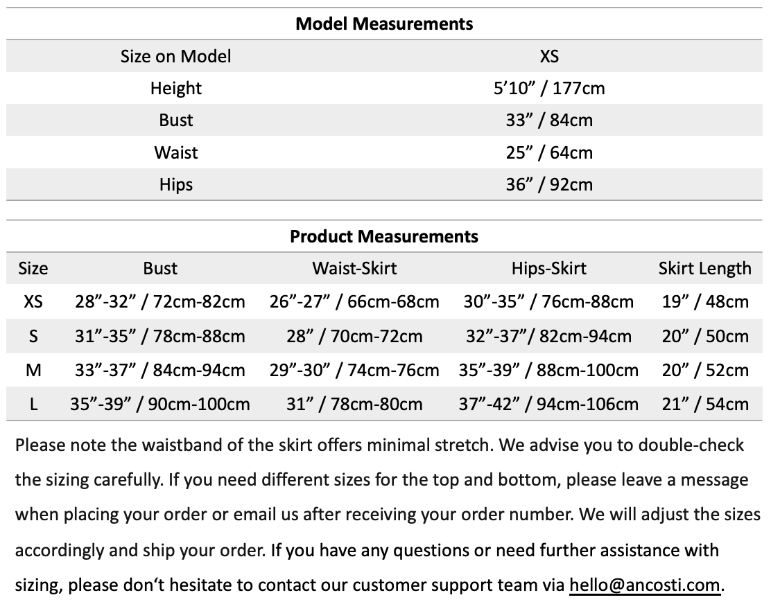 Please note the waistband of the skirt offers minimal stretch. We advise you to double-check the sizing carefully. If you find it challenging to decide between two sizes, opting for the larger size would ensure a more comfortable fit. If you need different sizes for the top and bottom, please leave a message when placing your order or email us after receiving your order number. We will adjust the sizes accordingly and ship your order.