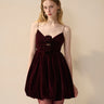 Make a stunning yet romantic statement in this velvet mini dress. Adjustable spaghetti straps and a chic backless style frame the silhouette, while delicate rosette details and a playful bubble hem add a touch of whimsical elegance.